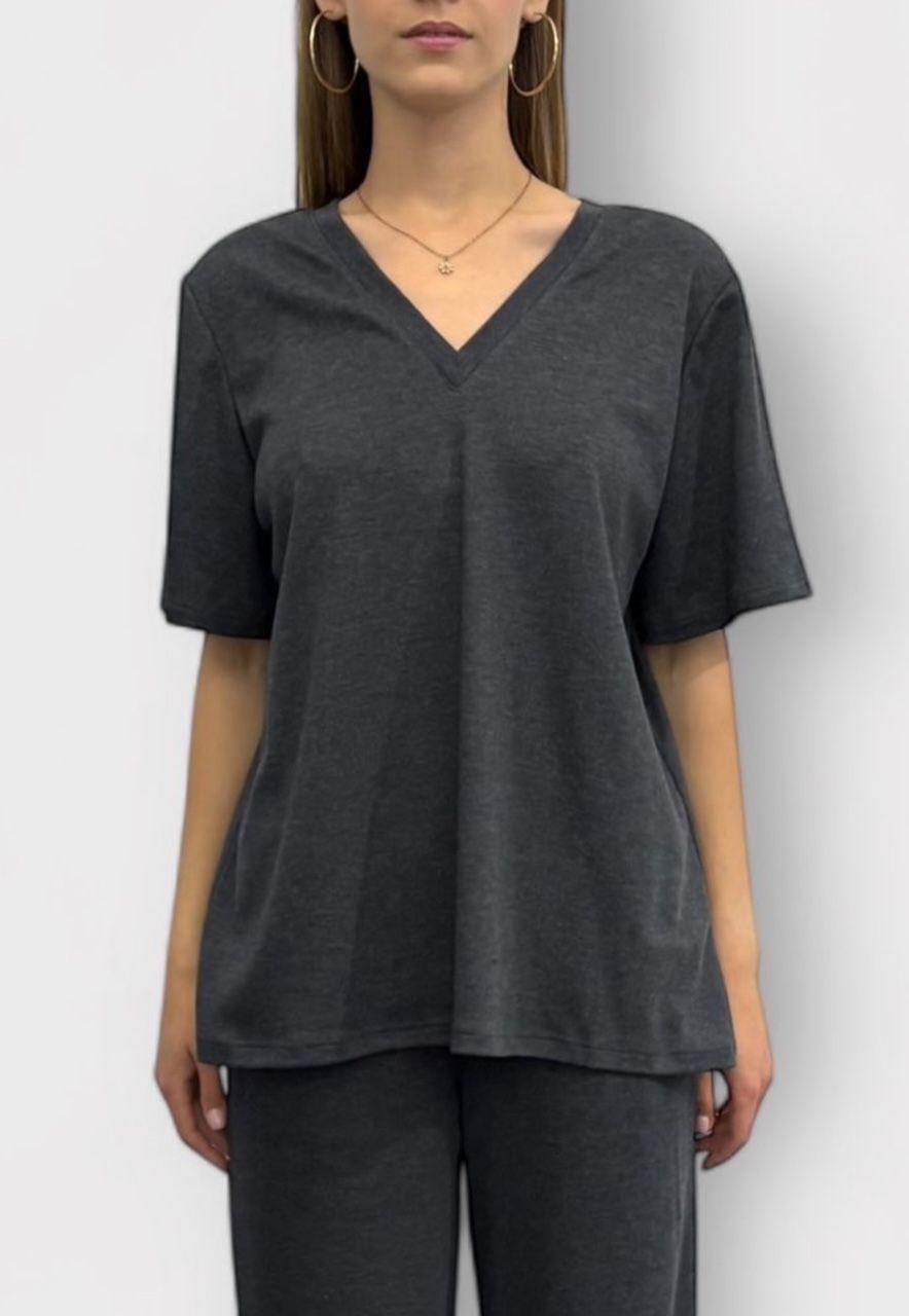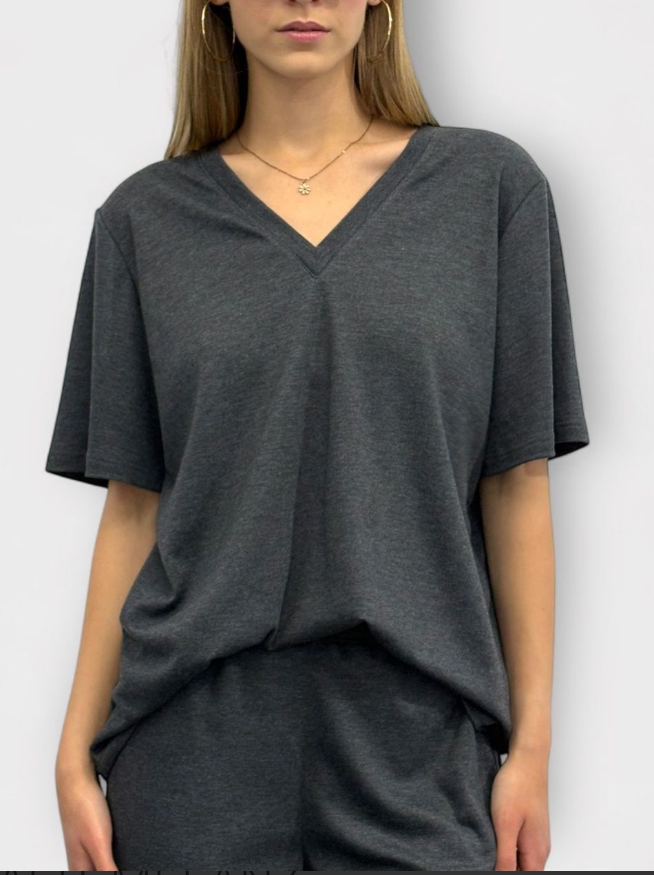 Grafitowy melanż bluzka / tshirt został specjalnie skonstruowany tak, by można go było nosić "tył" na przód - uzyskując albo dekolt V albo dekolt okrągły i wycięcie V na plecach