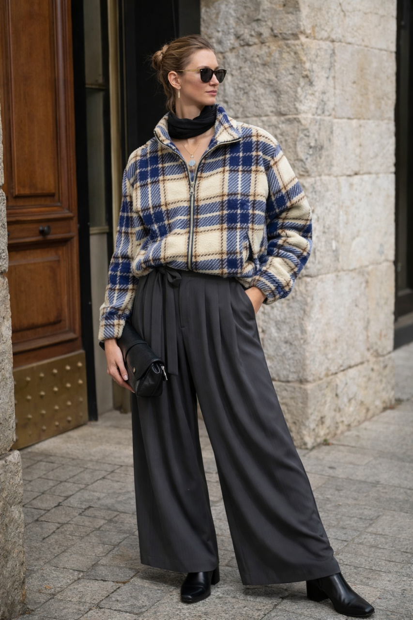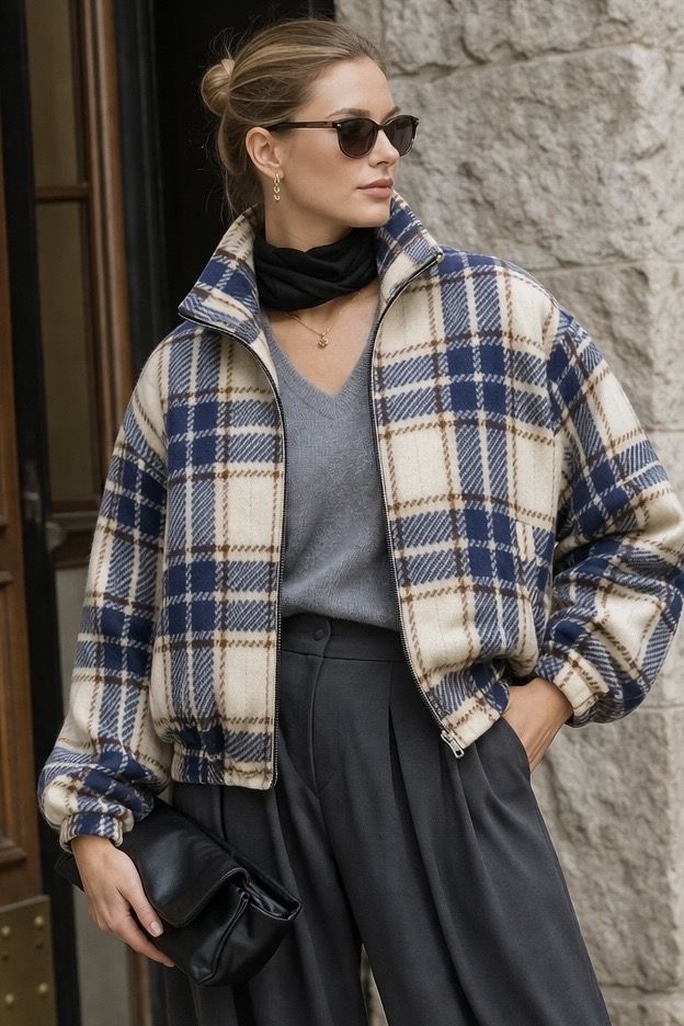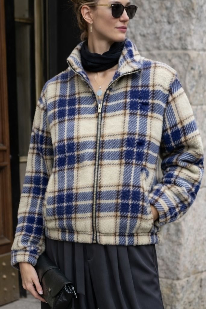 Wełniana kraciasta - niebiesko beżowa - uniseksowa przejściowa - uniwersalna w kroju i ponadczasowa kurtka ze stójką i suwakiem