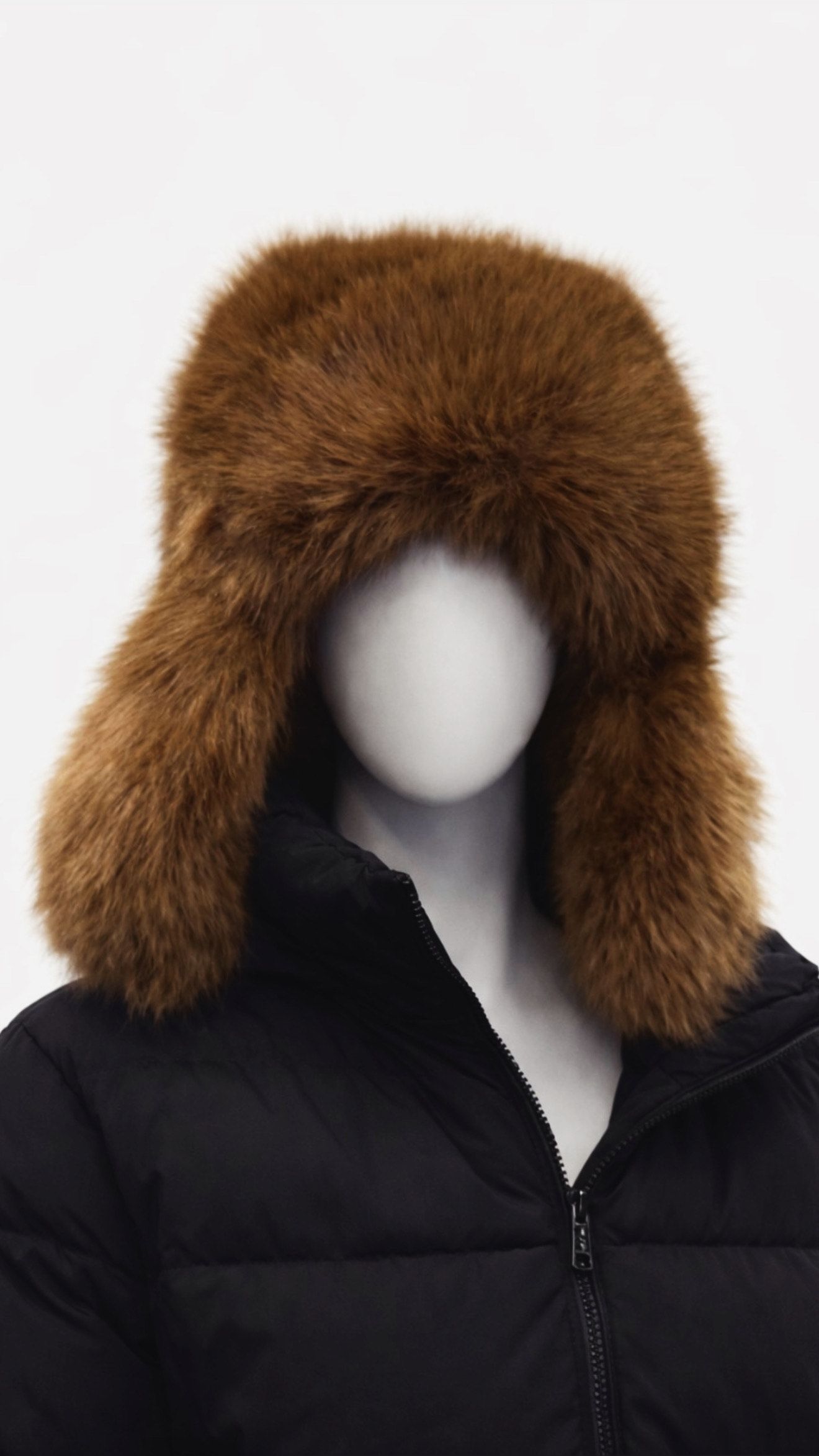Miękka futrzana czapka imitująca futro w kolorze brązowym. Materiał syntetyczny. Bardzo ciepła, idealna na zimę i niskie temperatury.