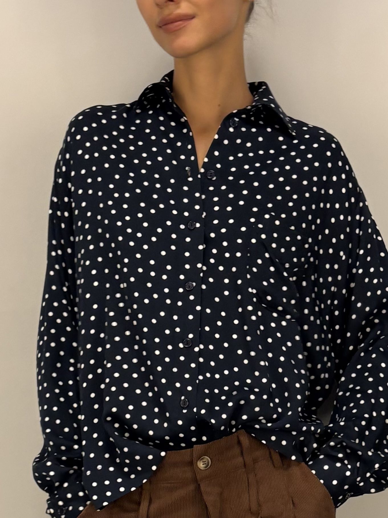 Lekka całoroczna oversize'owa Koszula My Style - wreszcie w Waszej wiskozowej, satynowej tkaninie w kolorze granatowym w klasyczny biały francuski groszek