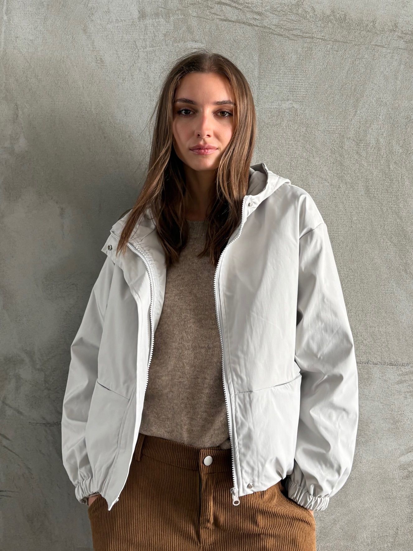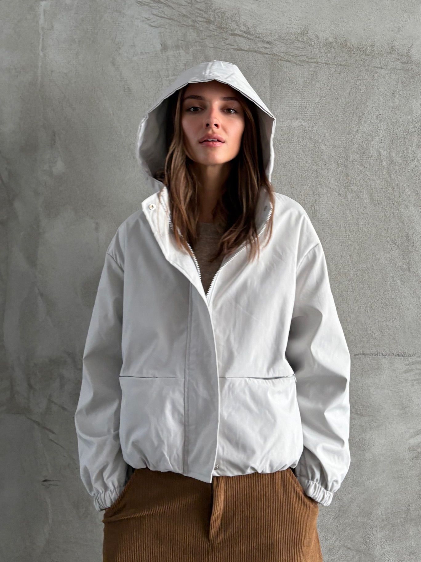 A versatile and comfortable white hooded jacket.