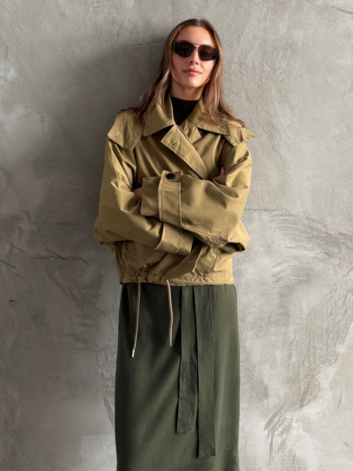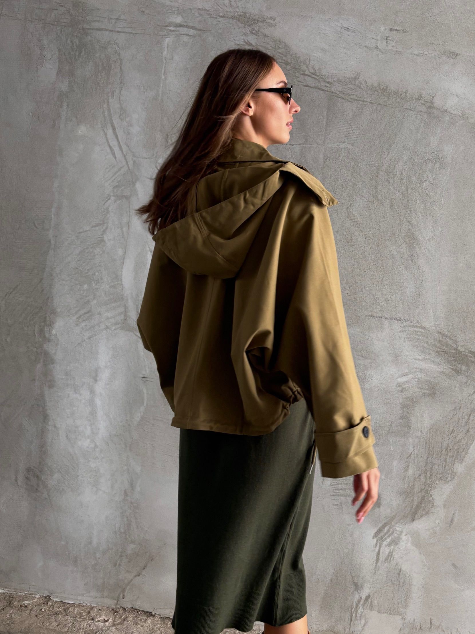 Uniwersalna i komfortowa kurtka w kolorze khaki z odpinanym kapturem, który można zapiąć pod szyją w wietrzny i chłodny dzień