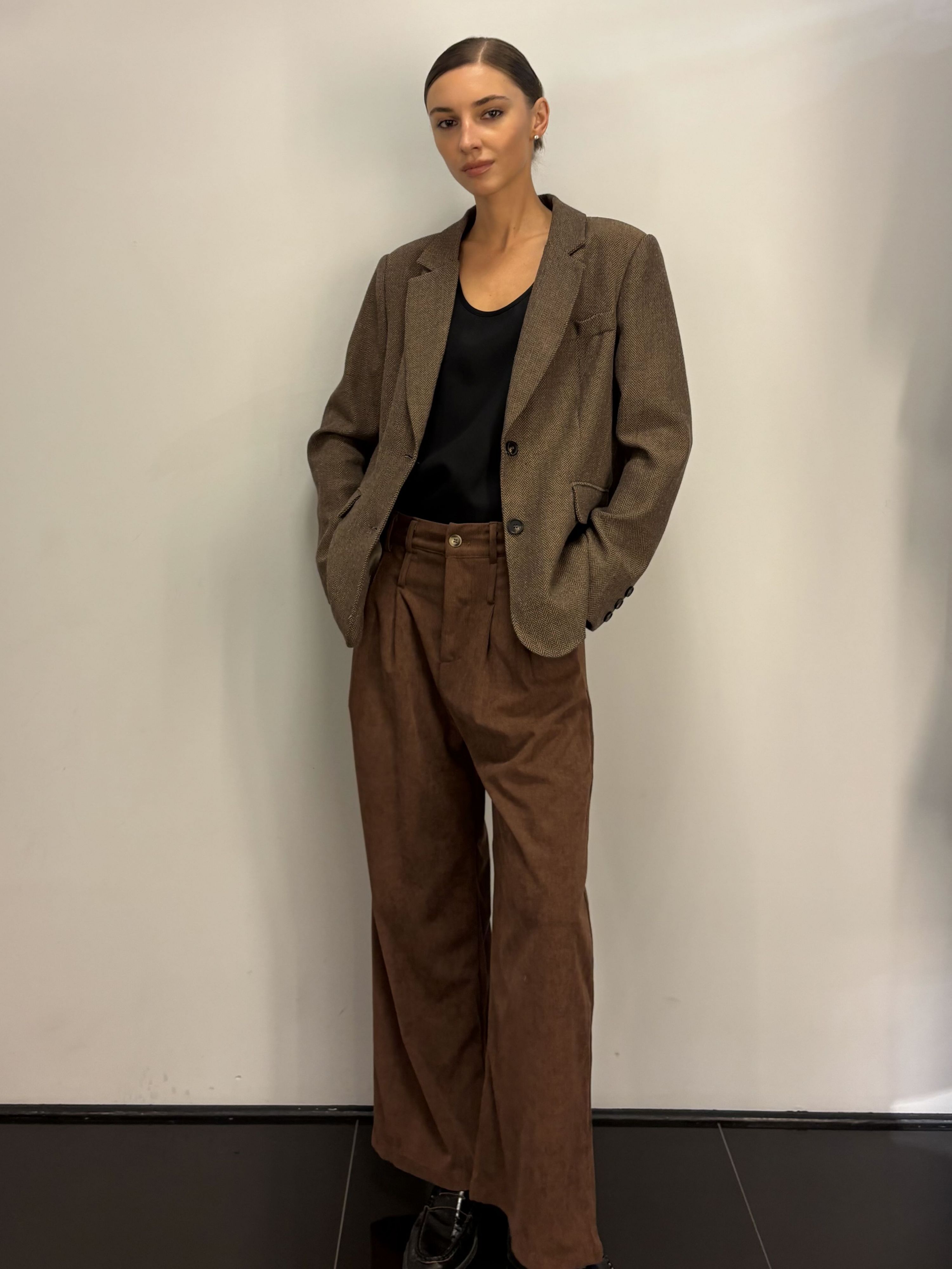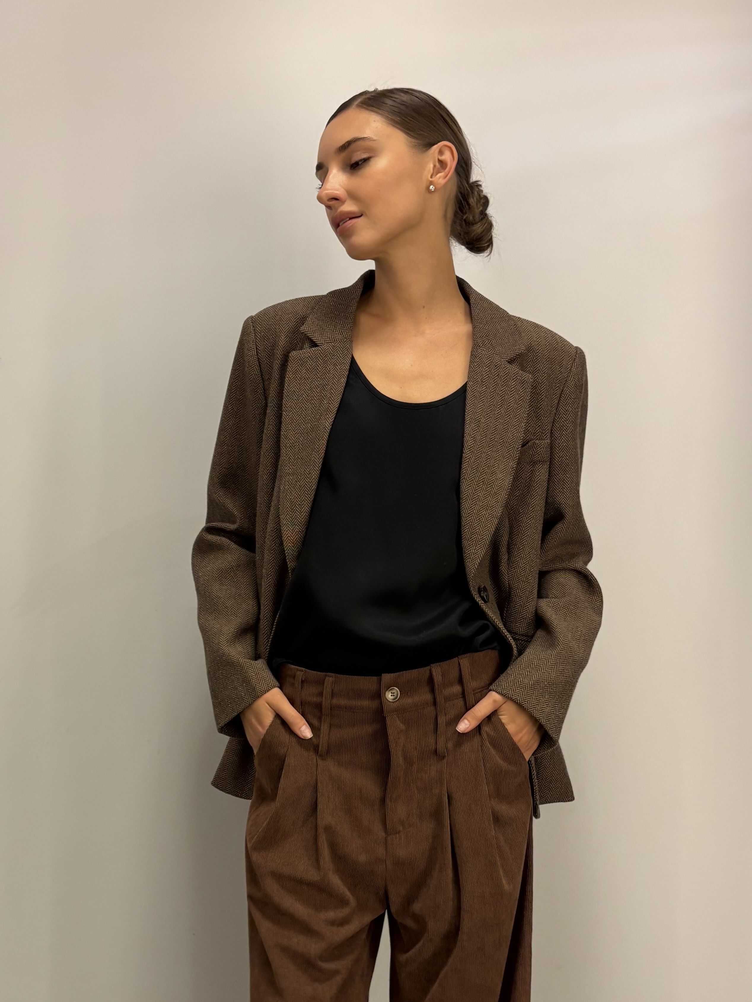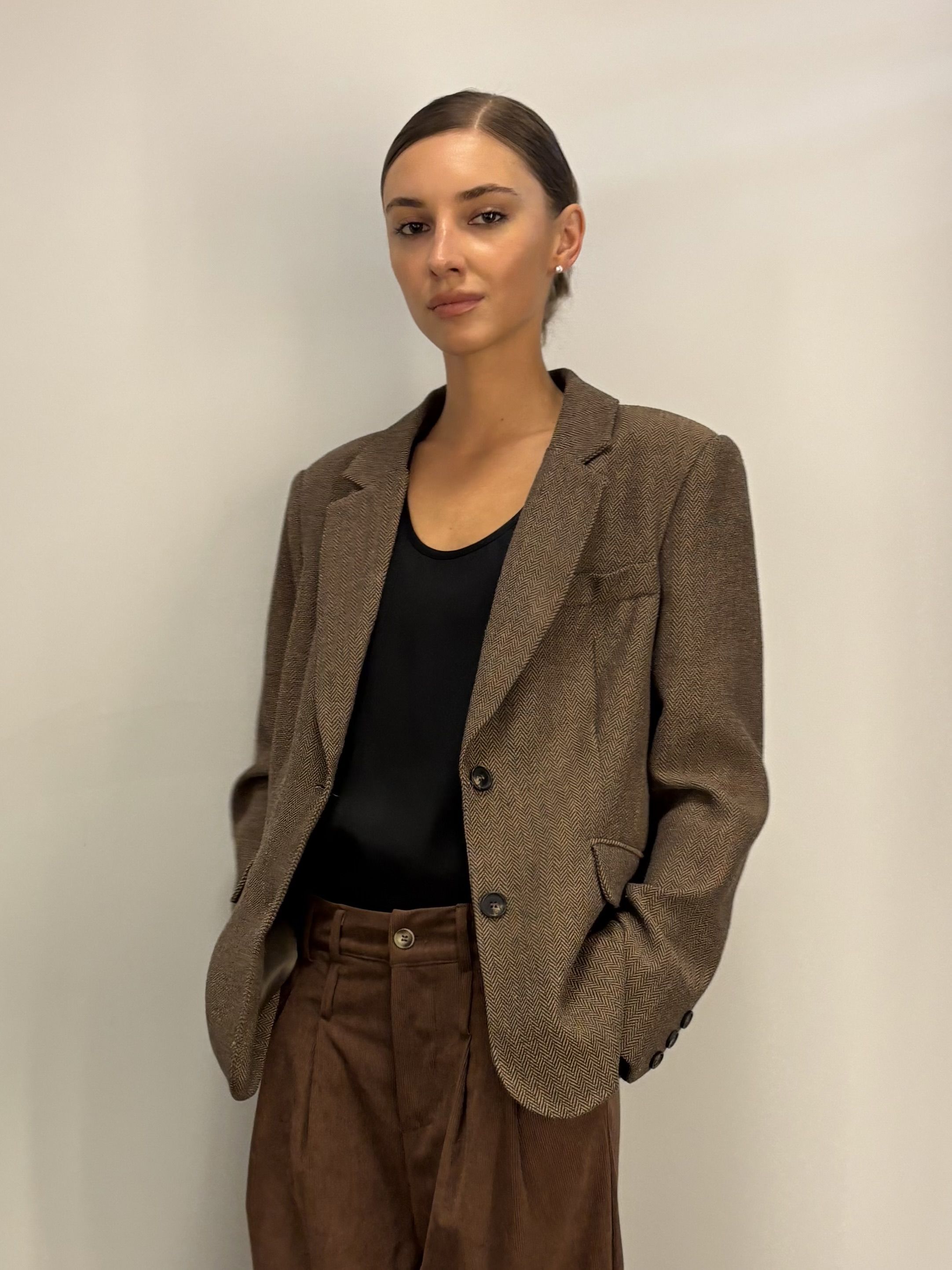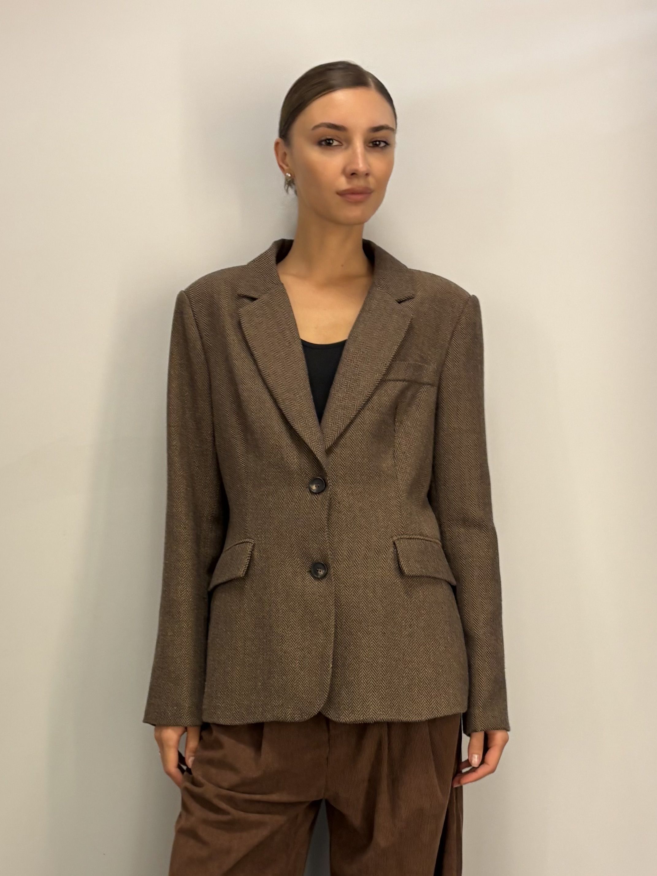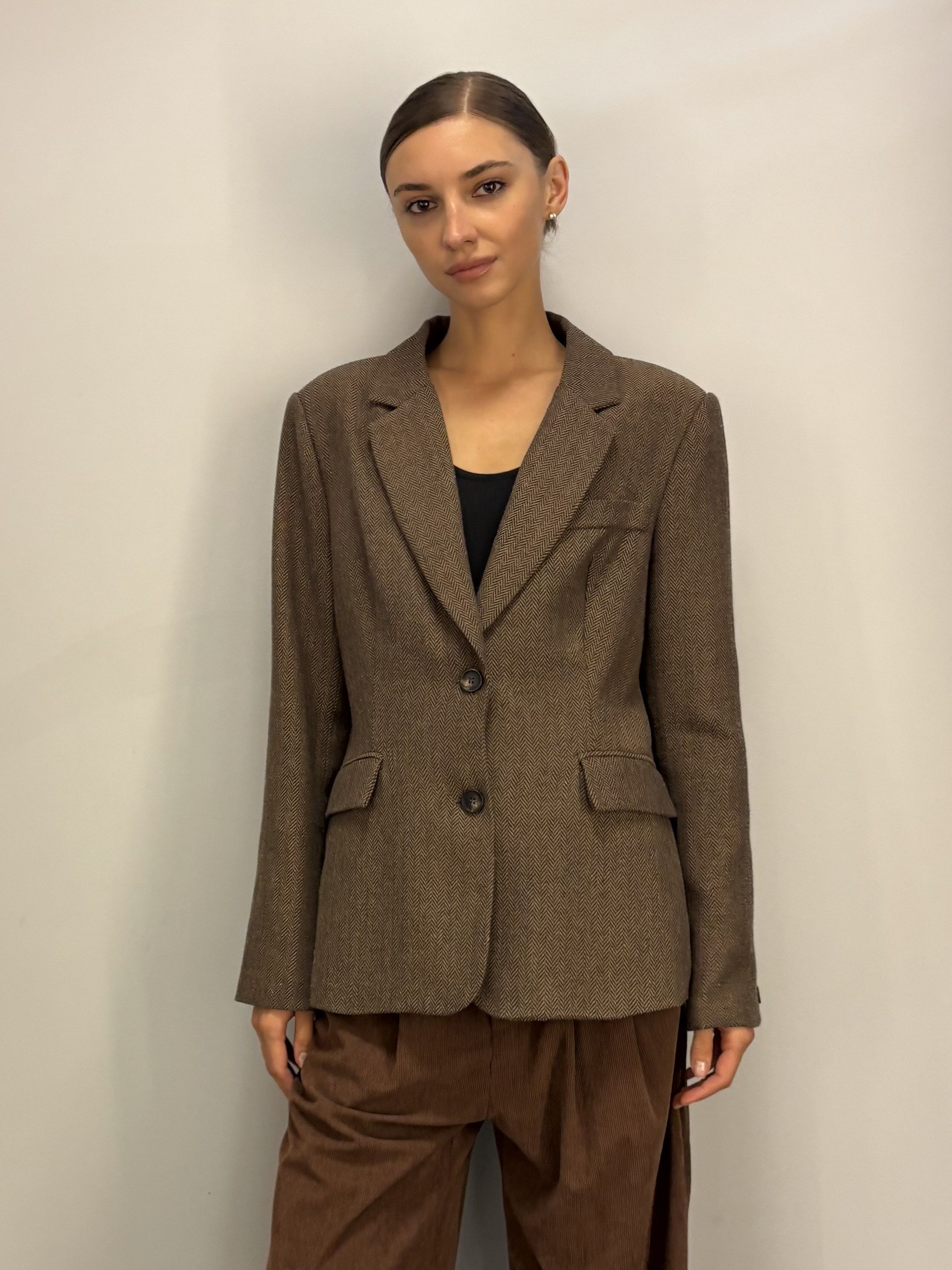 Klasyczna BRĄZOWA wełniana marynarka z dwoma guzikami wełniana we wzór drobnej jodełki (lekko taliowana)