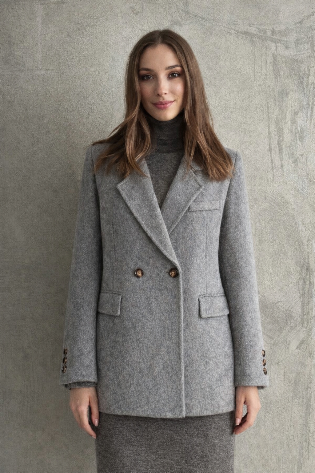 szara kurtko-marynarka - dobrze posłuży jako cieplejsze okrycie wierzchnie lub ciepła marynarka czy wełniana narzutka. Odporna na zagniecenia. Miękka w dotyku, nie gryzie. 100% wełna.