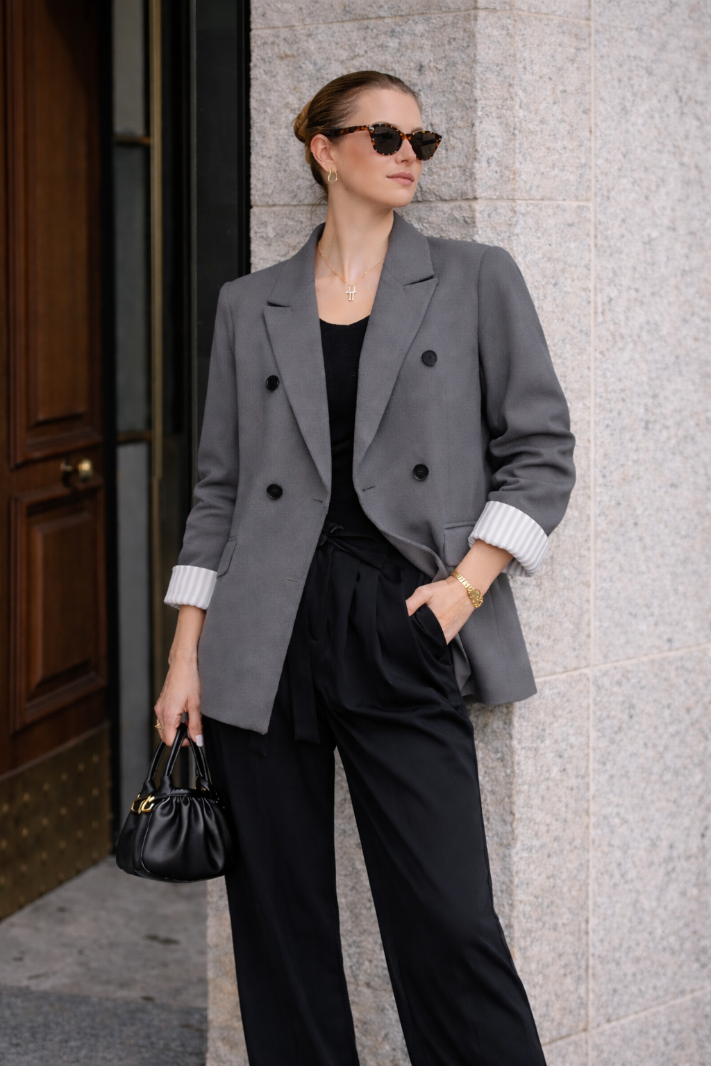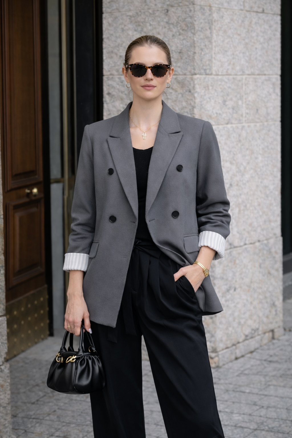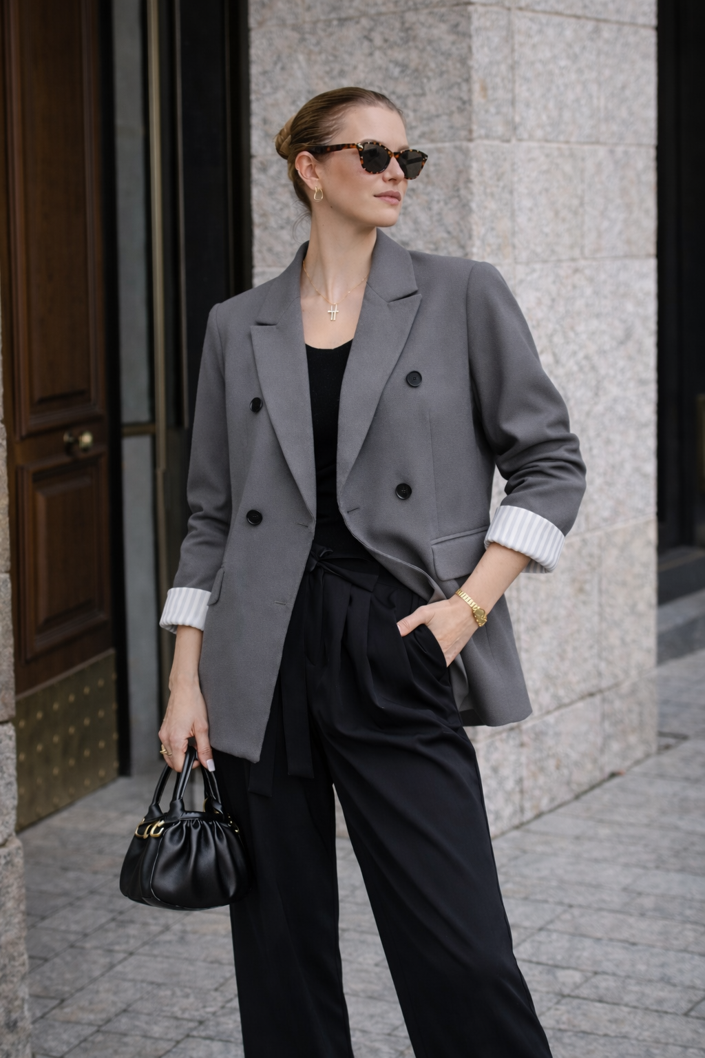nowa marynarka - krój dwurzędowy z wyżej wszytymi guzikami i poszewką w paski