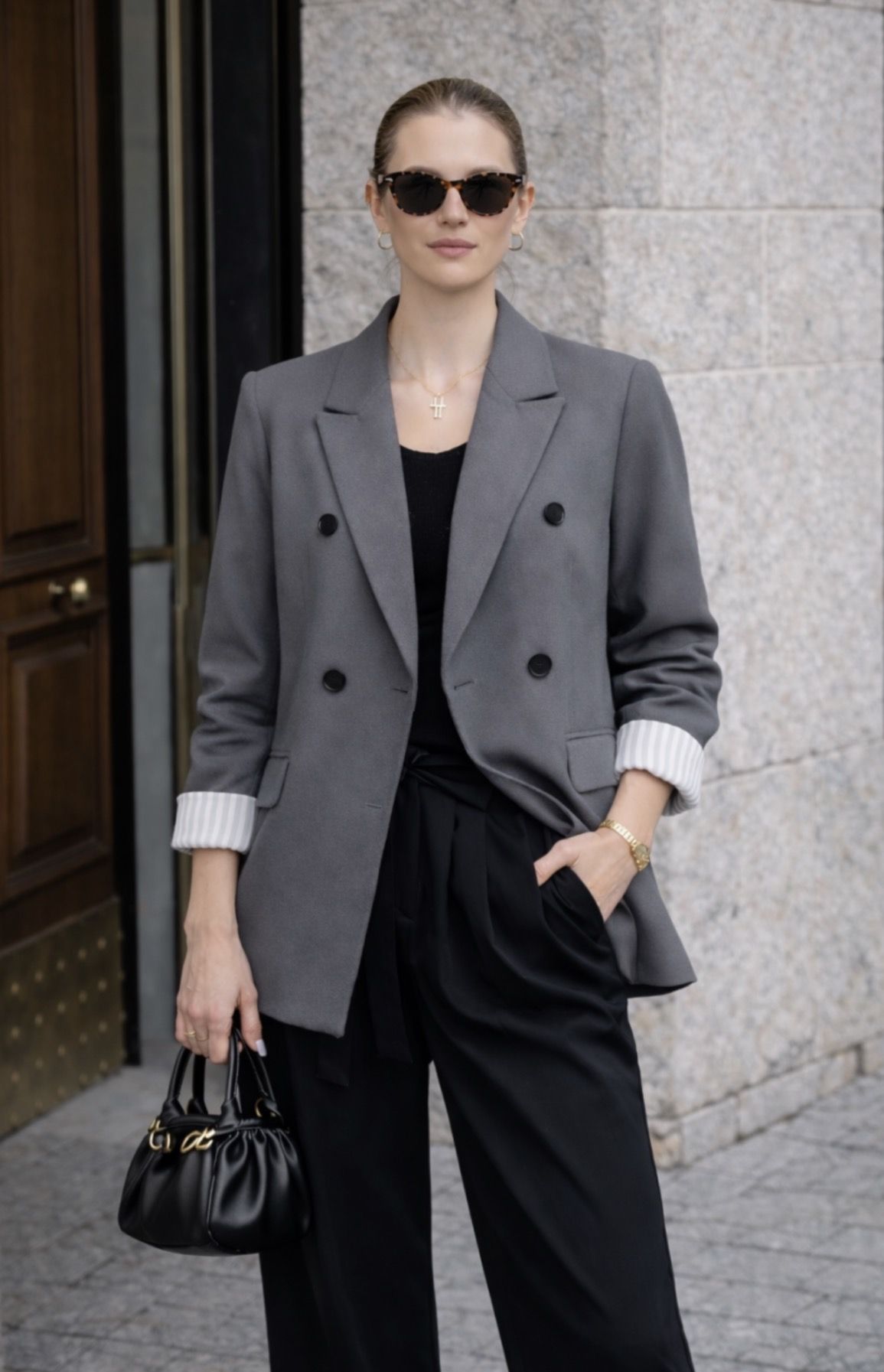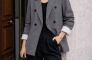 Szara uniwersalna nowa marynarka lub płaszczyk lub kurtka - krój dwurzędowy z wyżej wszytymi guzikami i poszewką w paski