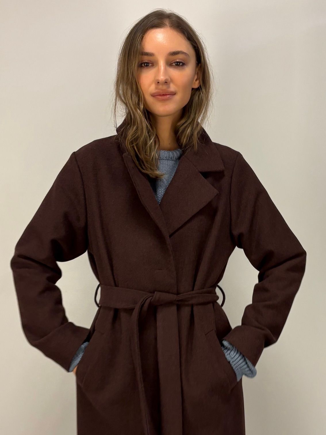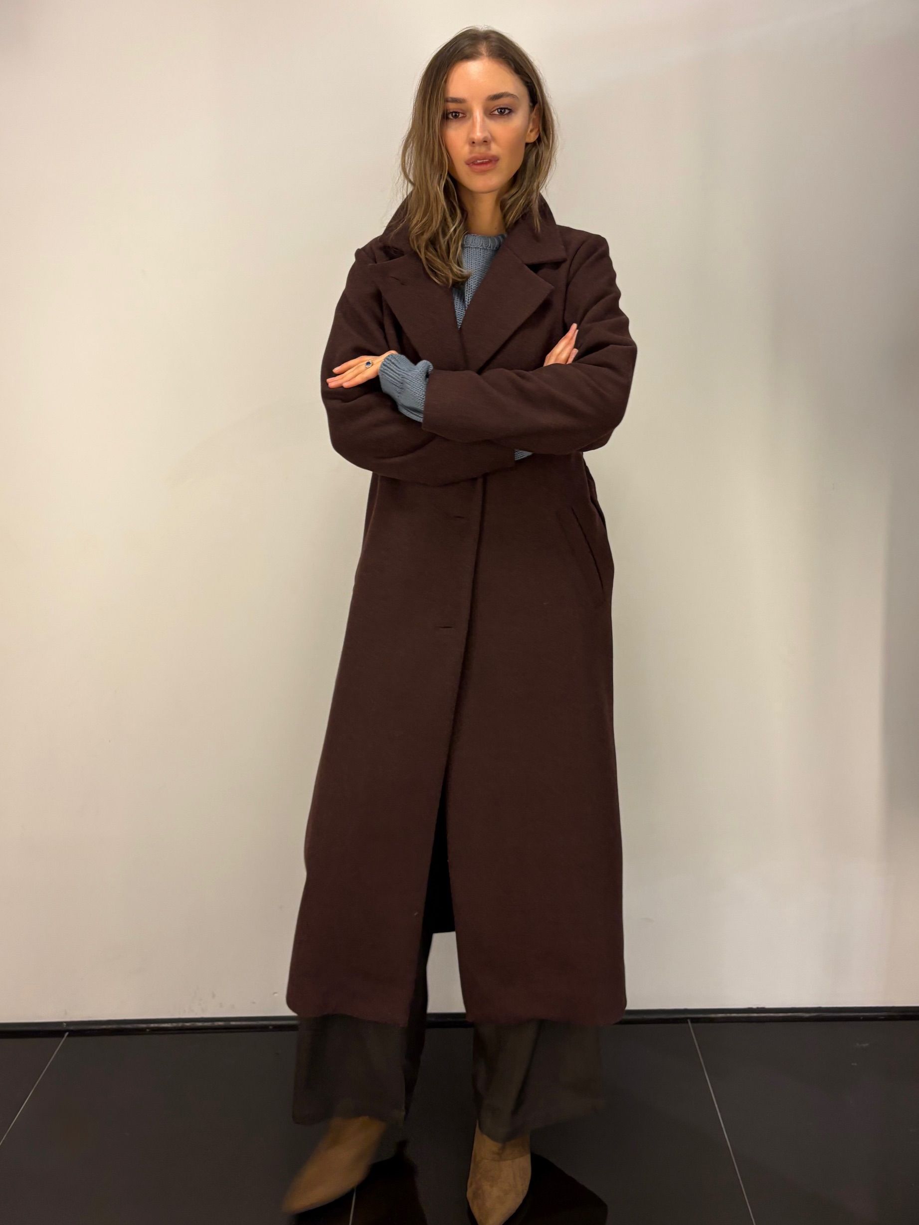Płaszcz przejściowy lub - z wełnianą marynarką czy grubym swetrem - zimowy.
