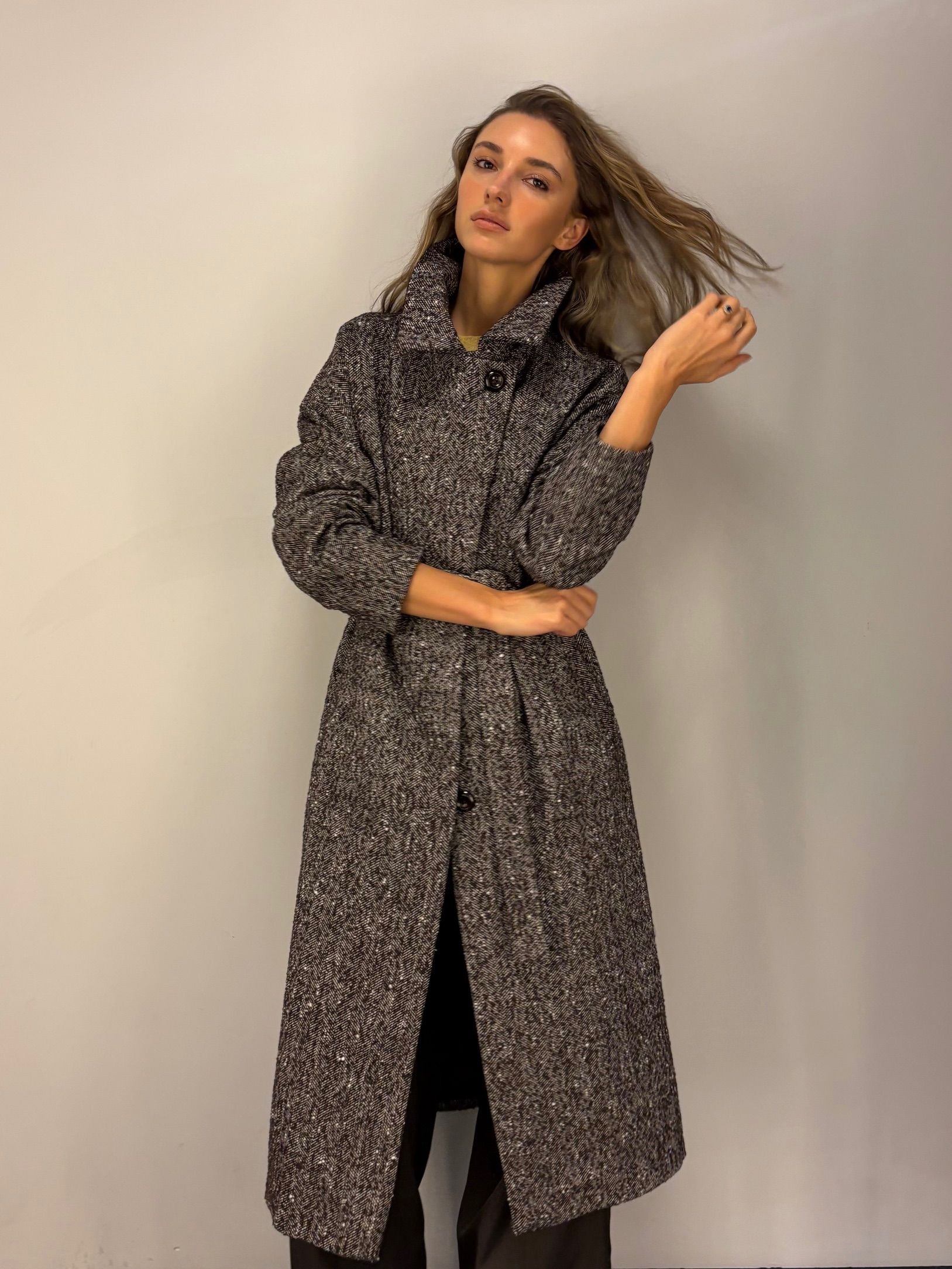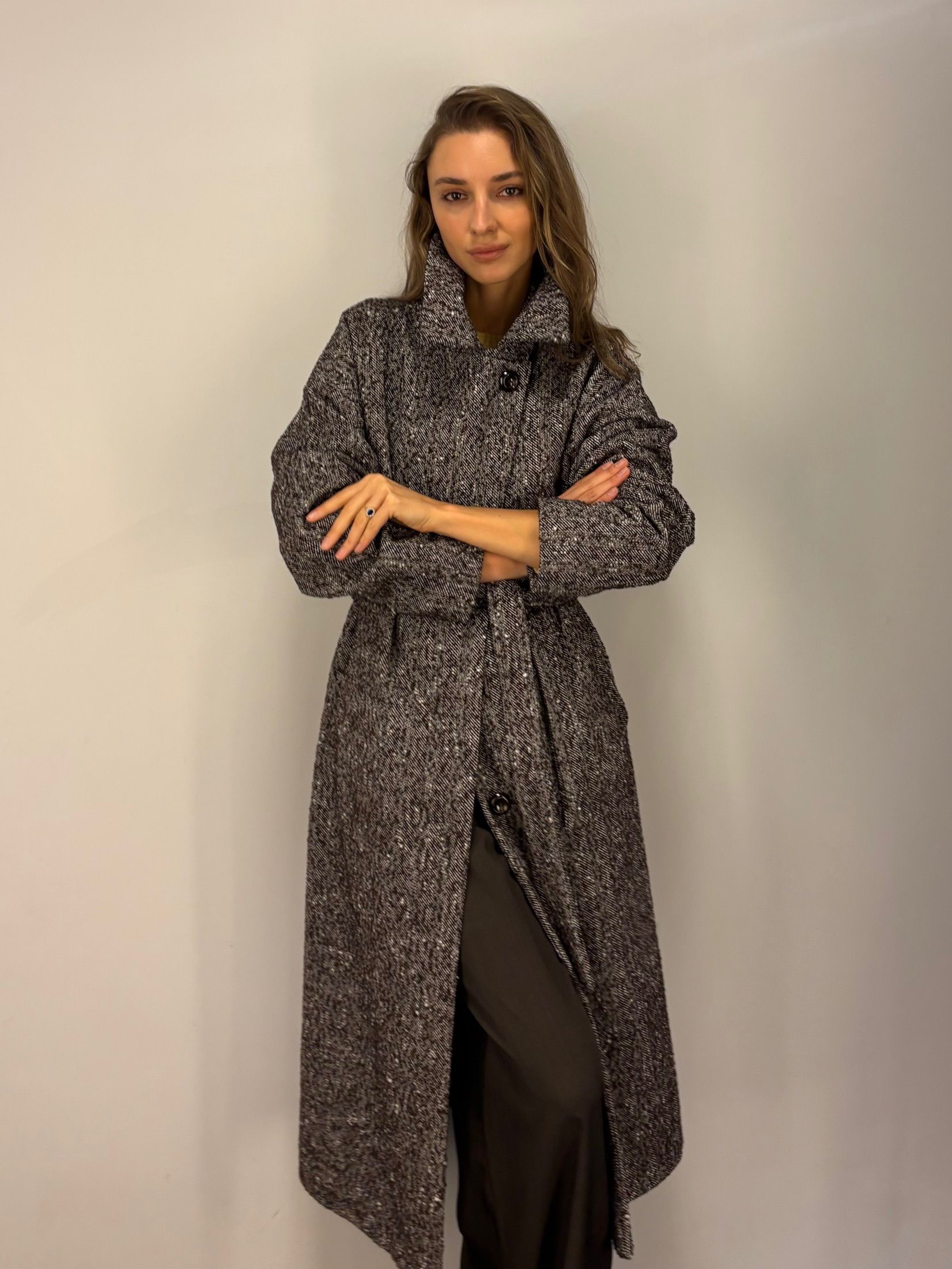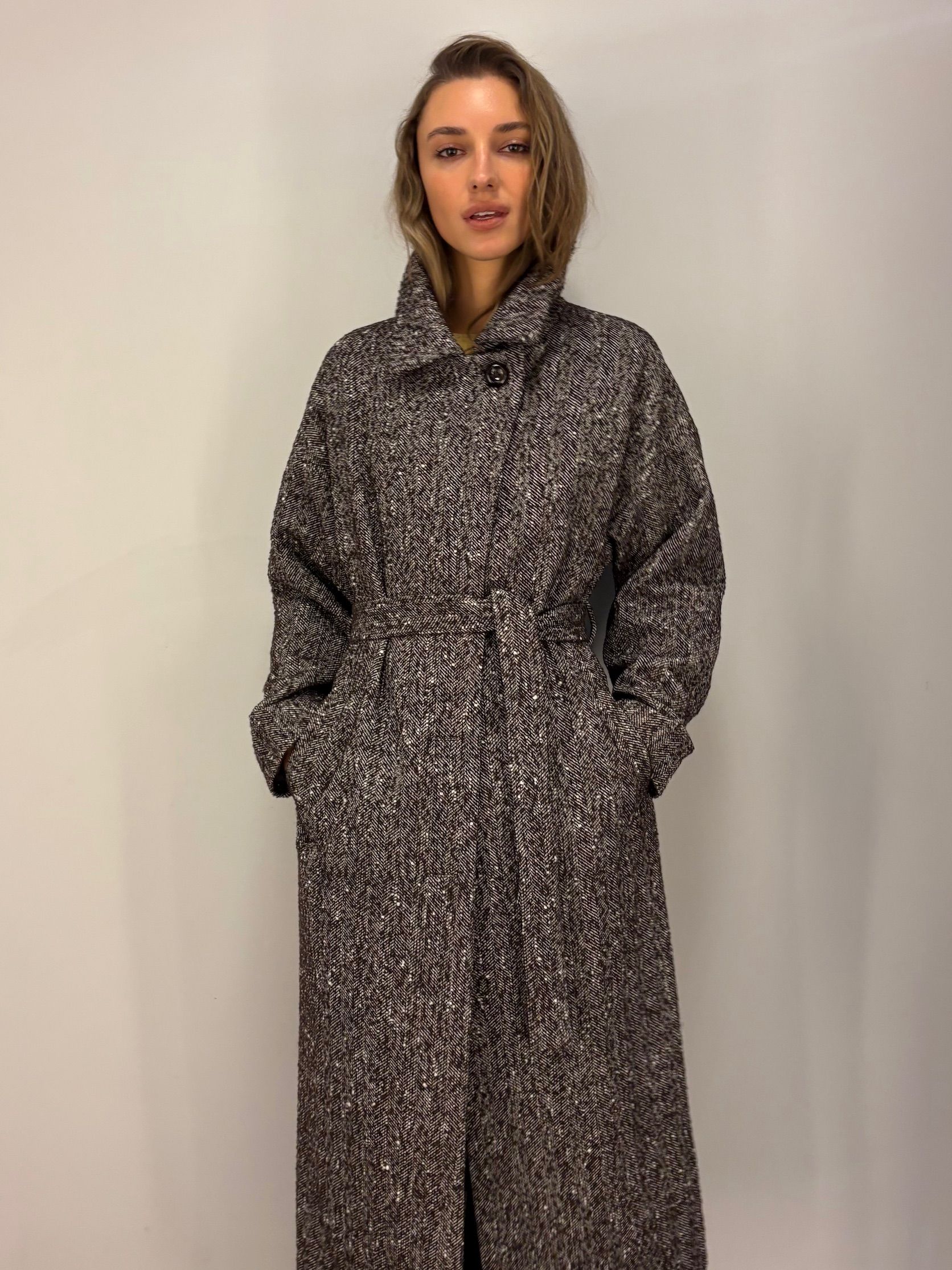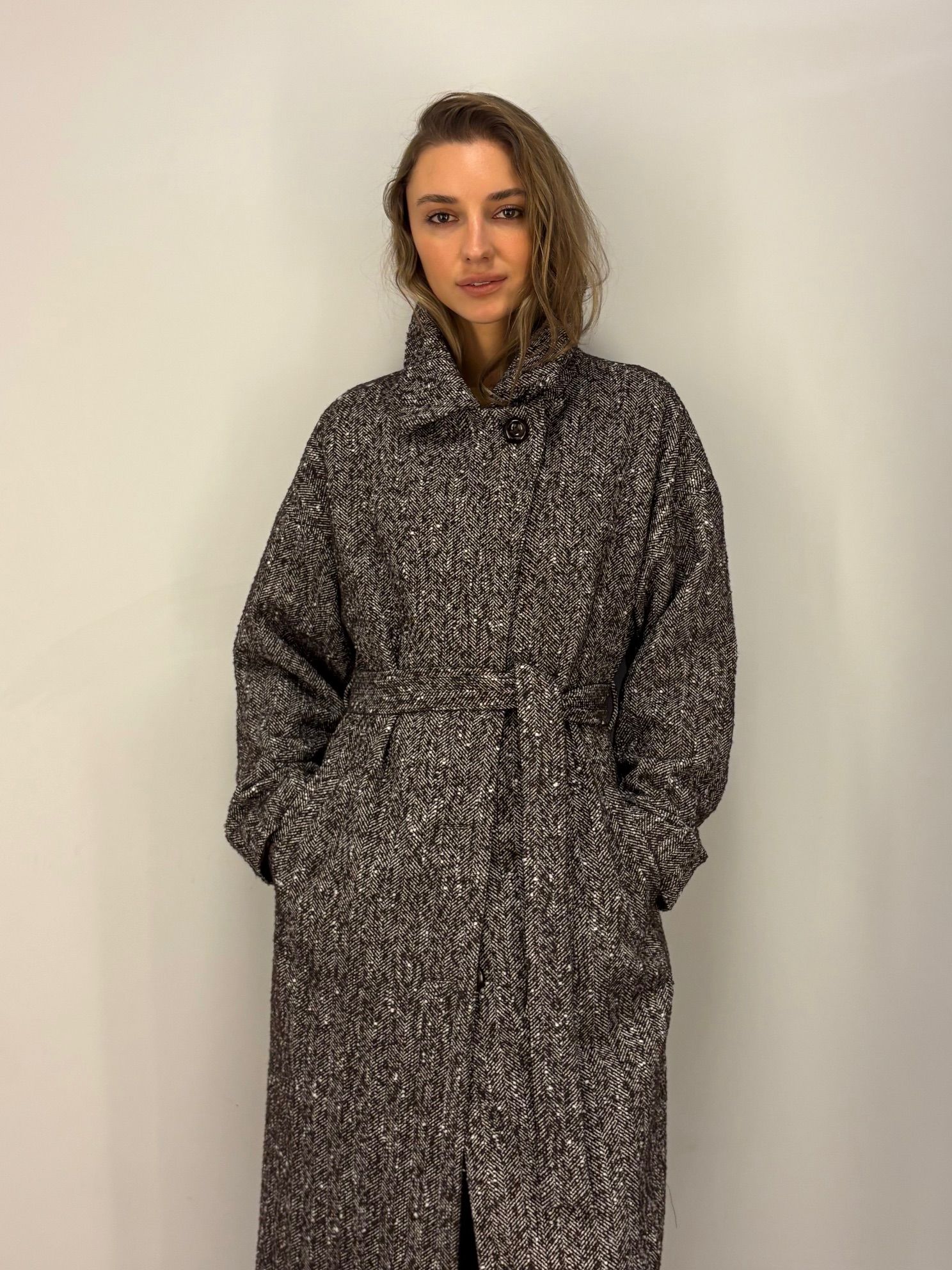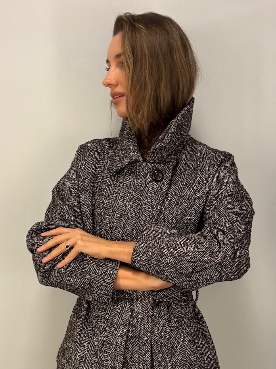 Wełniany kobiecy płaszcz w brązową jodełkę (model Kind of magic) z paskiem. 100% wełny.