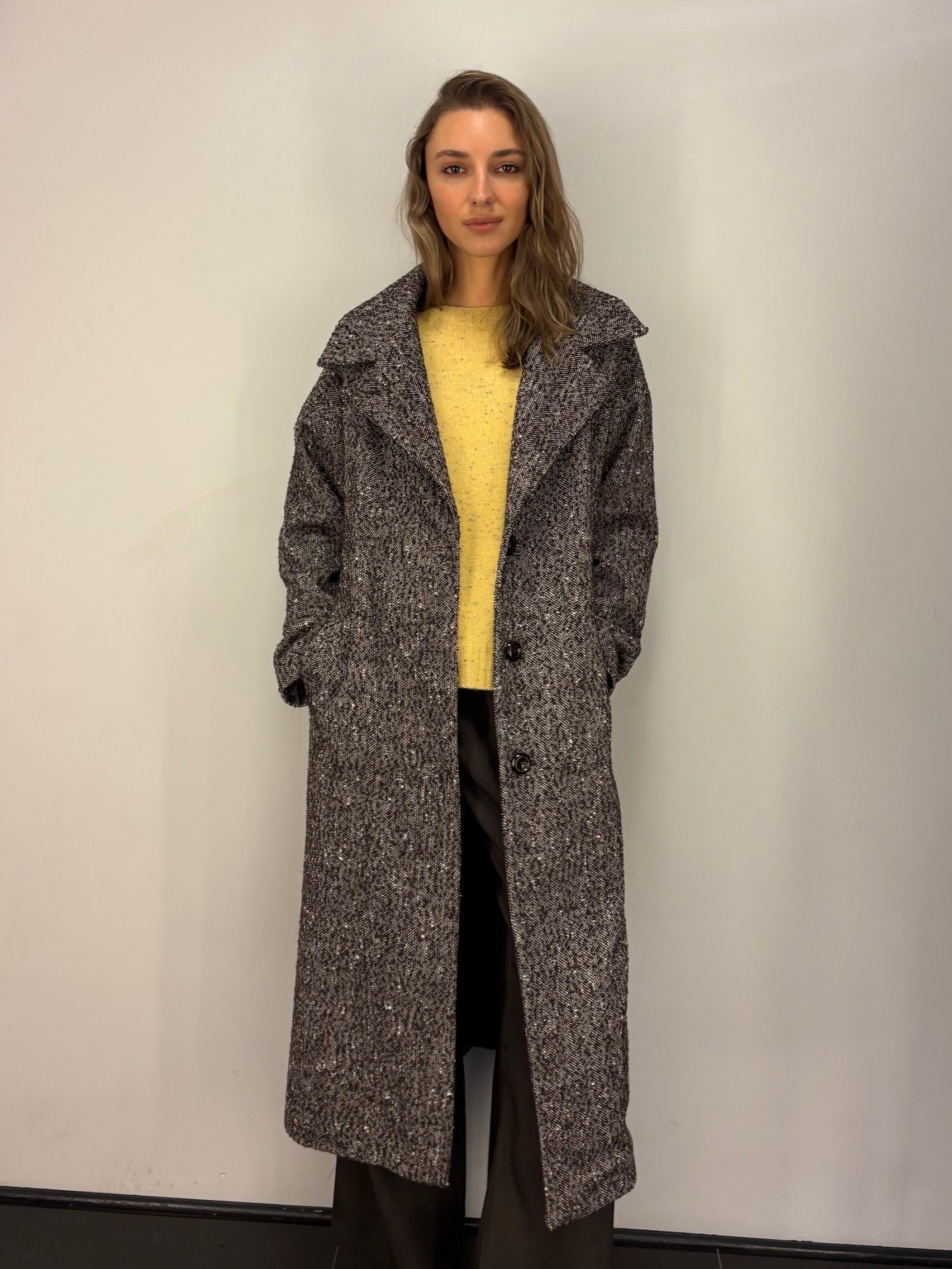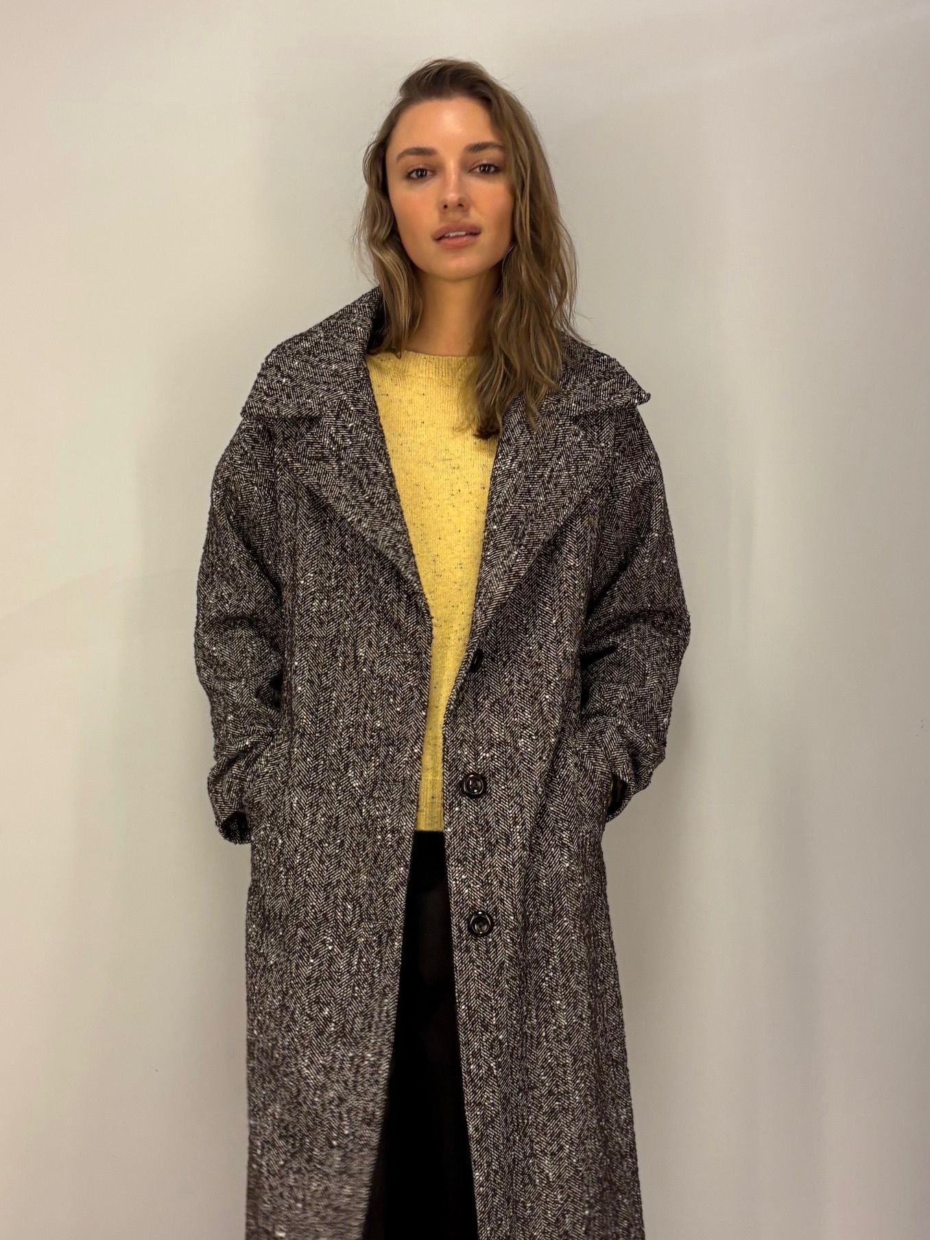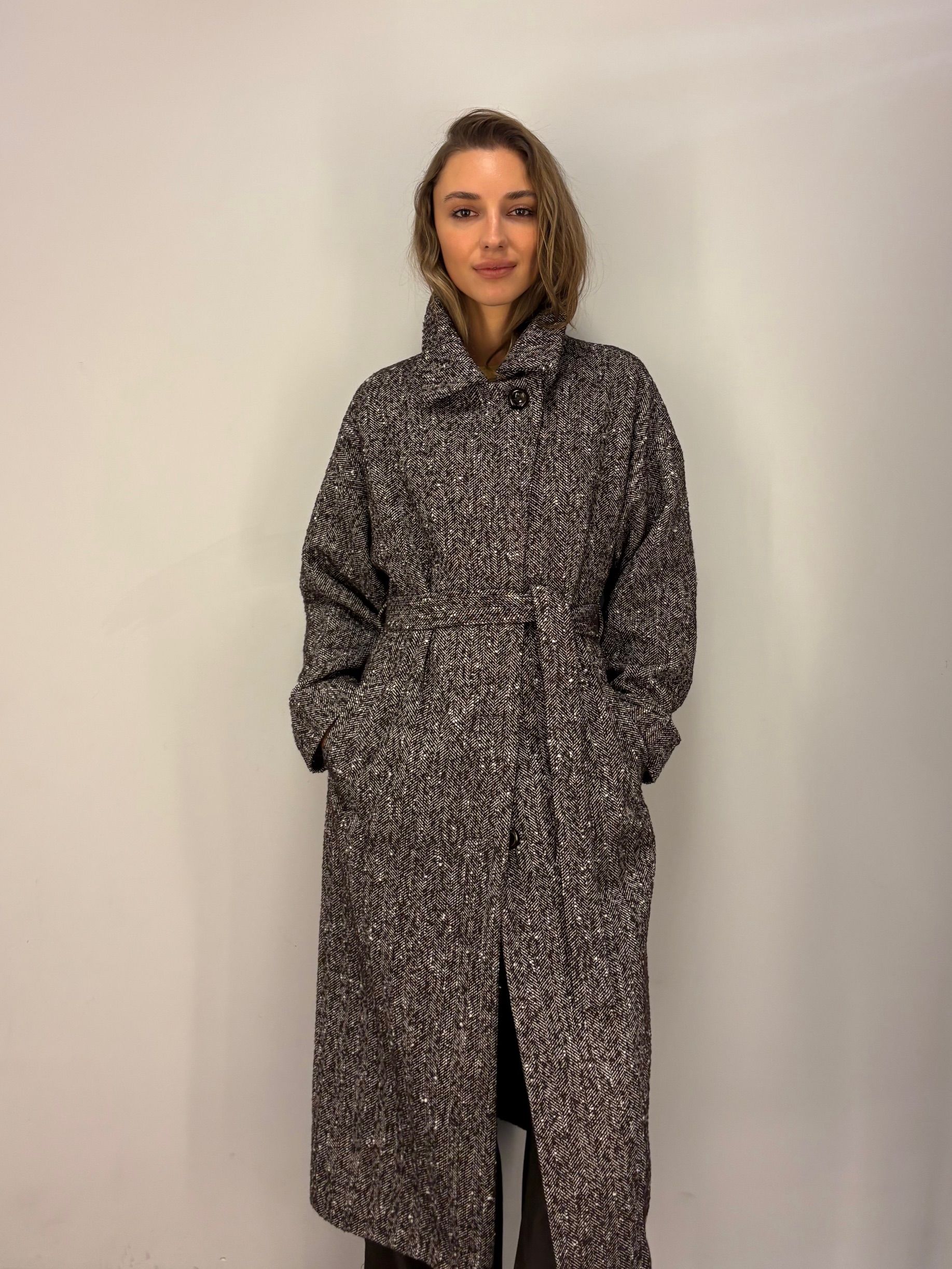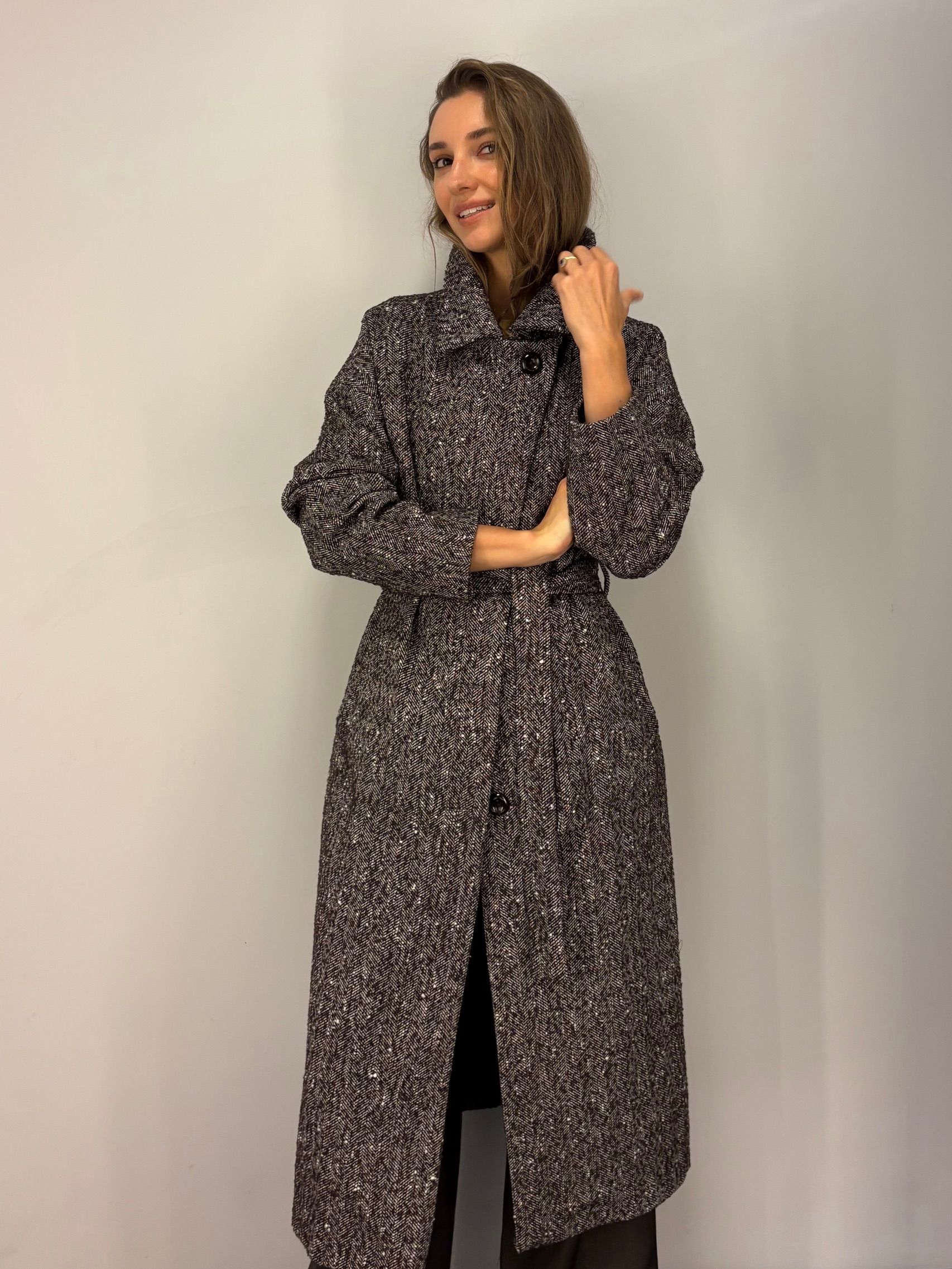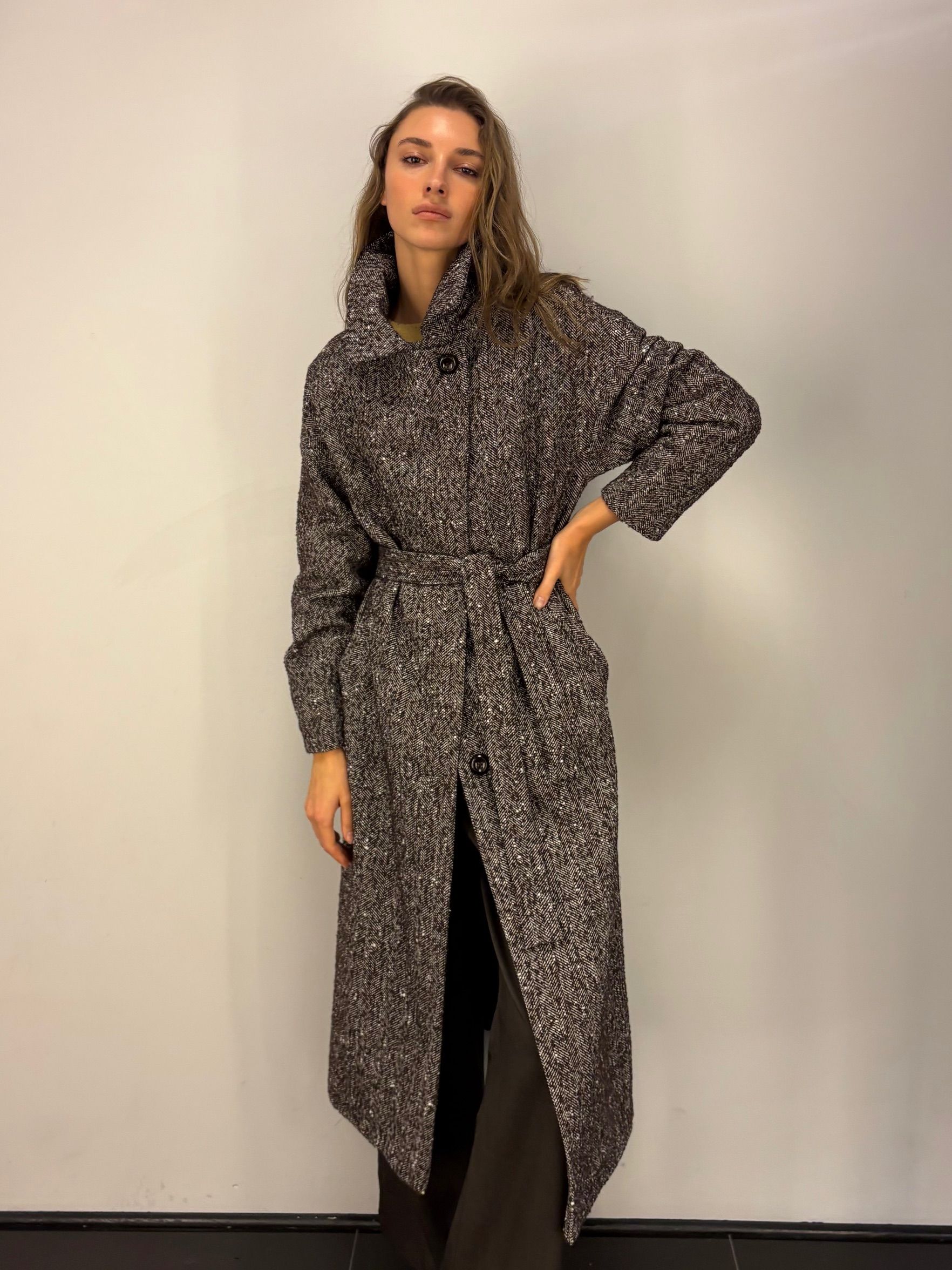 Wełniany kobiecy płaszcz w brązową jodełkę (model Kind of magic) z paskiem. 100% wełny.
