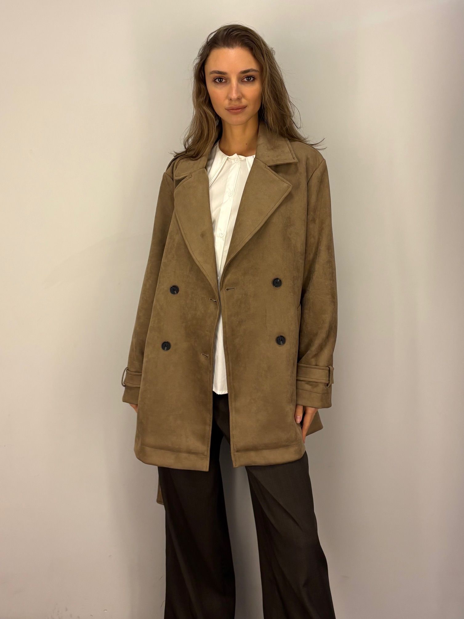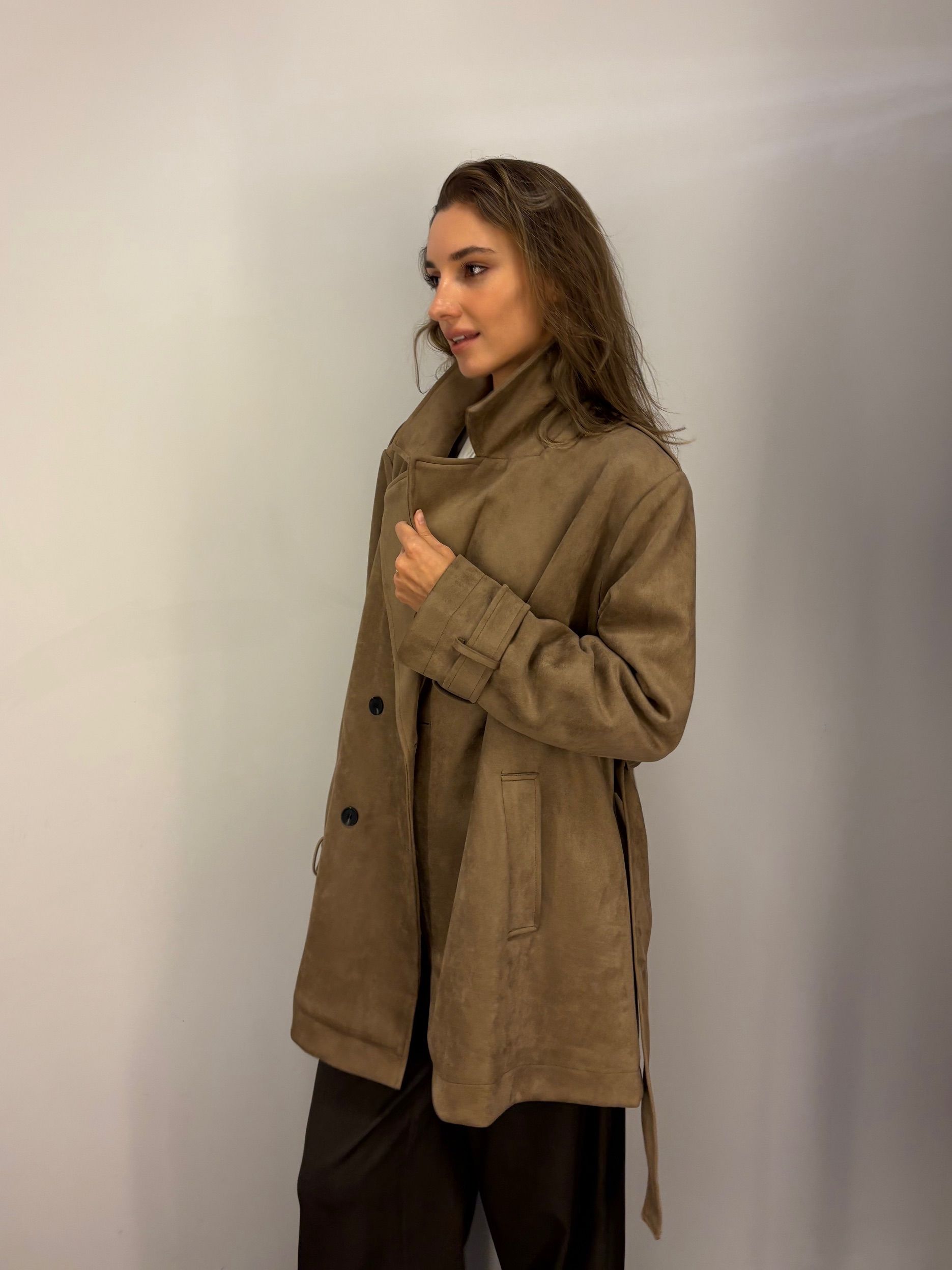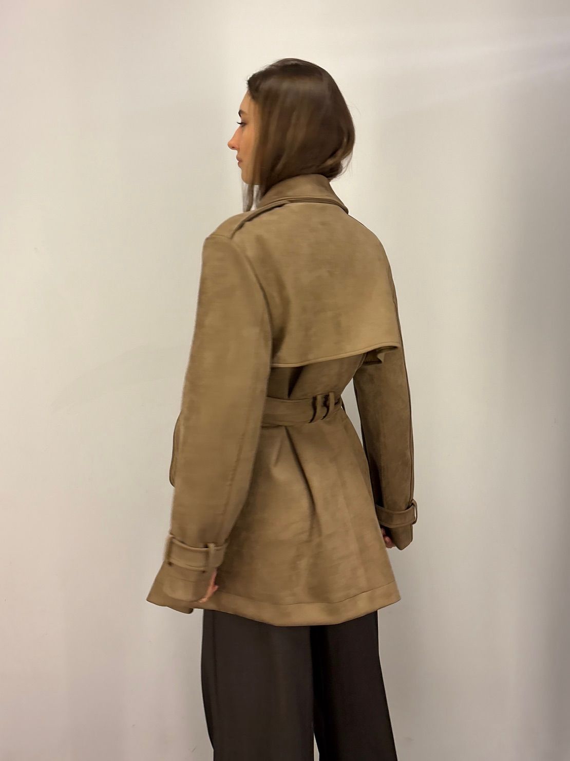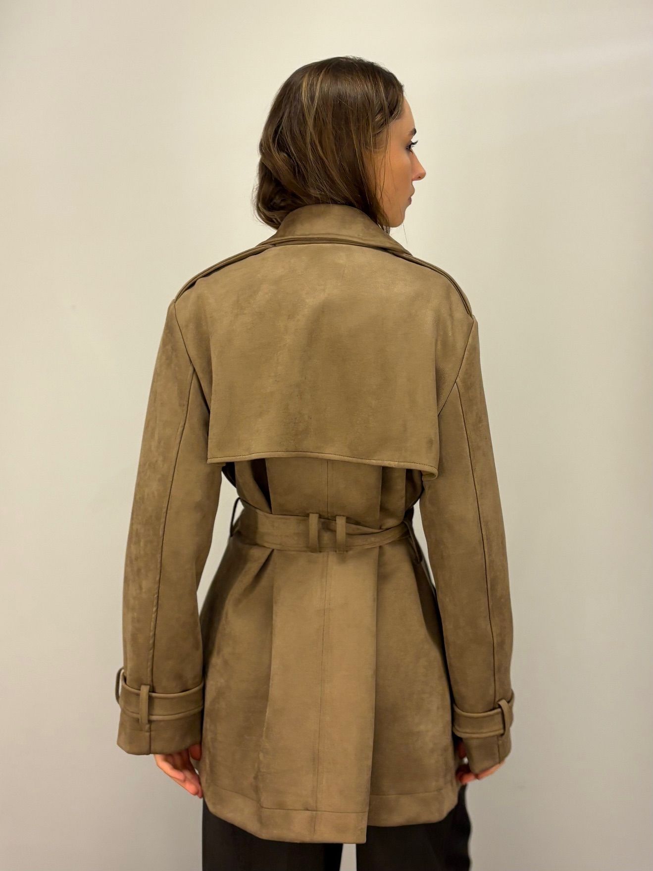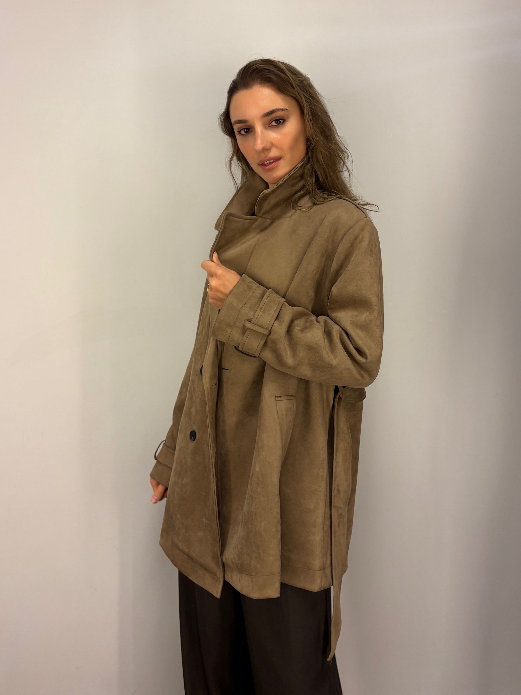 NOWOŚĆ na wiosnę 2026 - kobiecy płaszcz krótki w odcieniu oliwkowej zieleni, khaki, wpadającej w szarość.