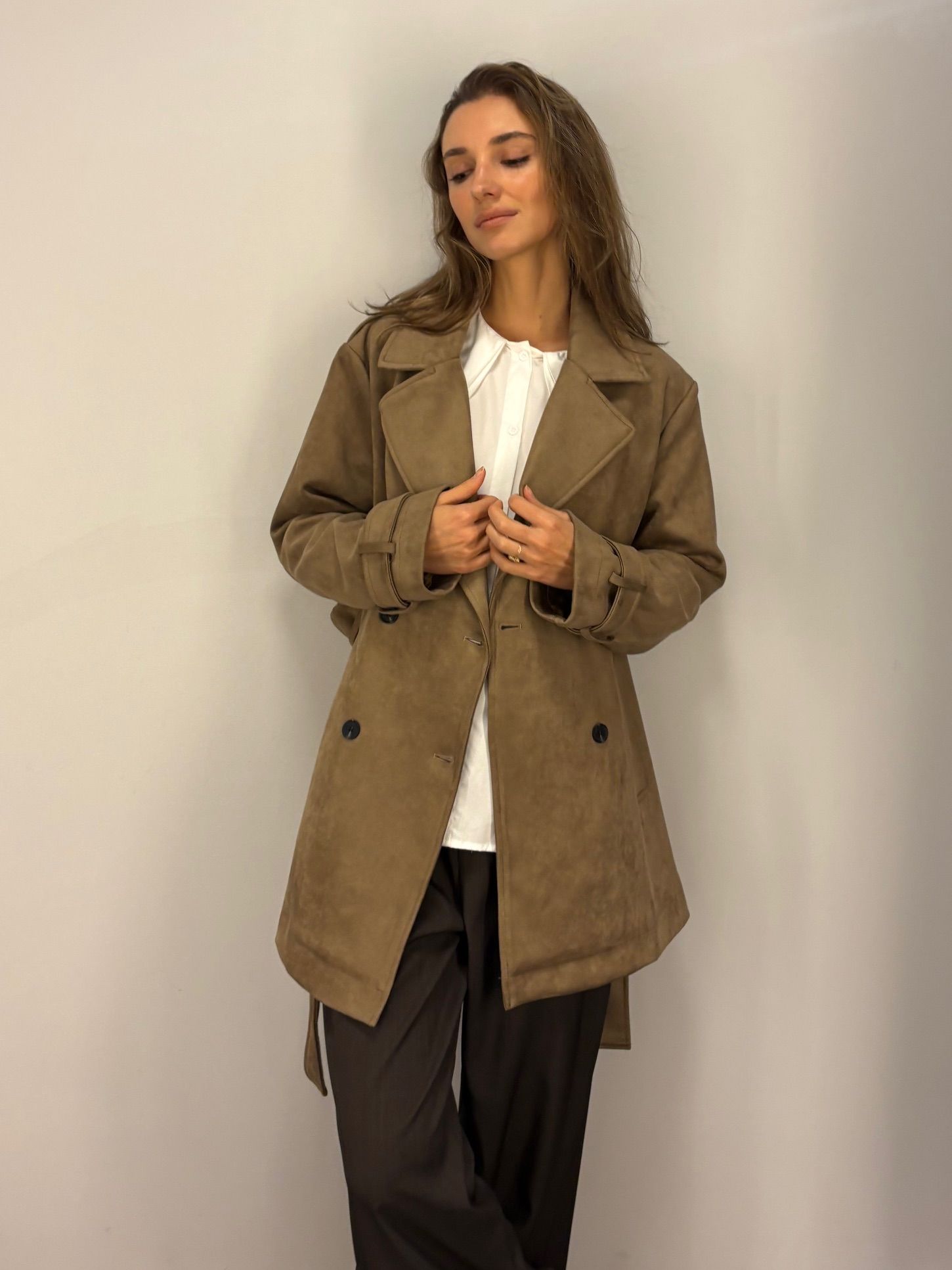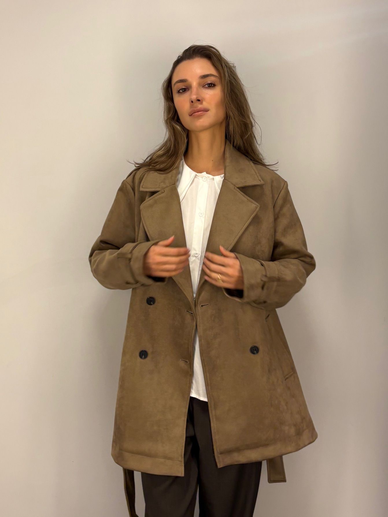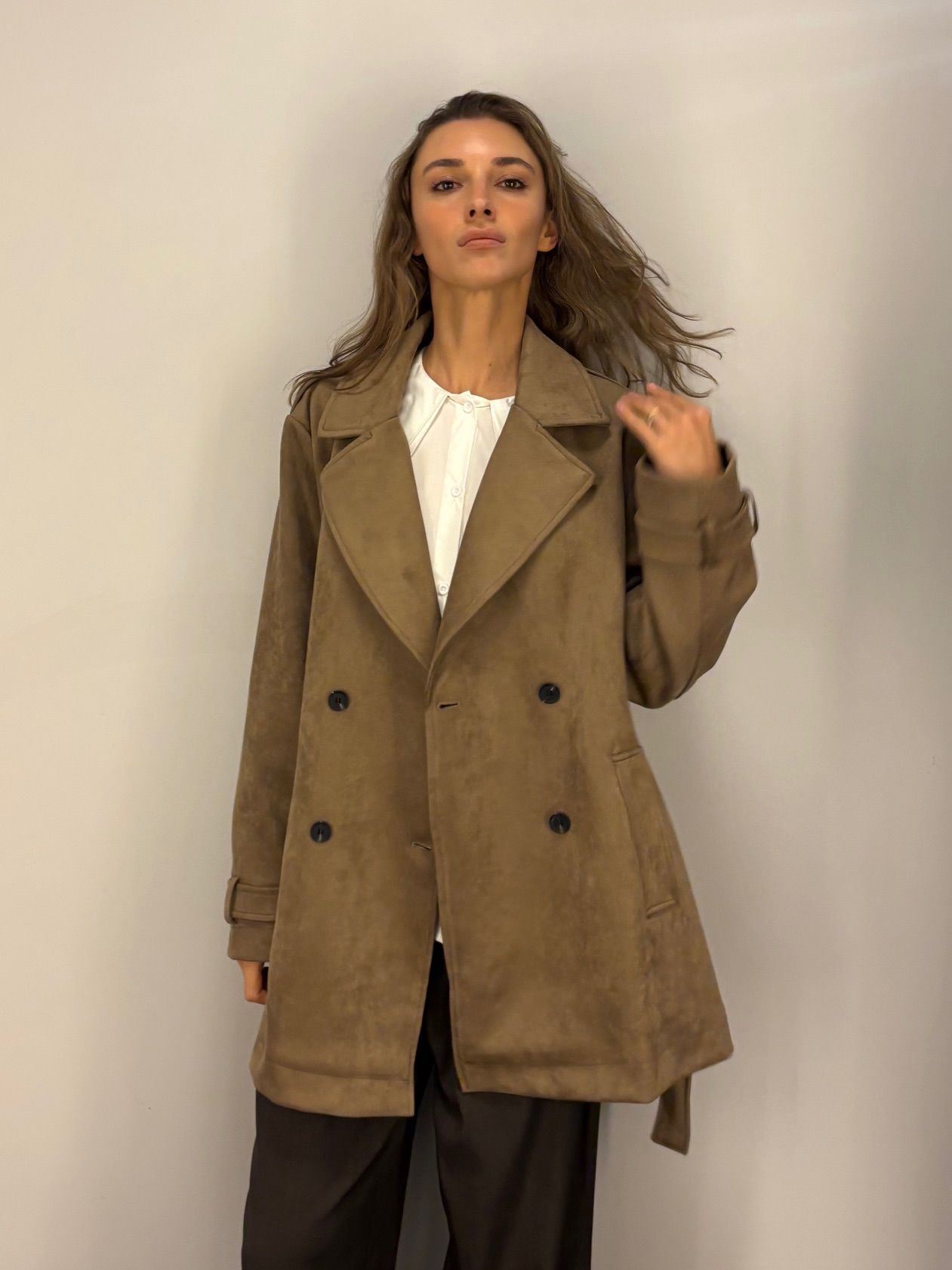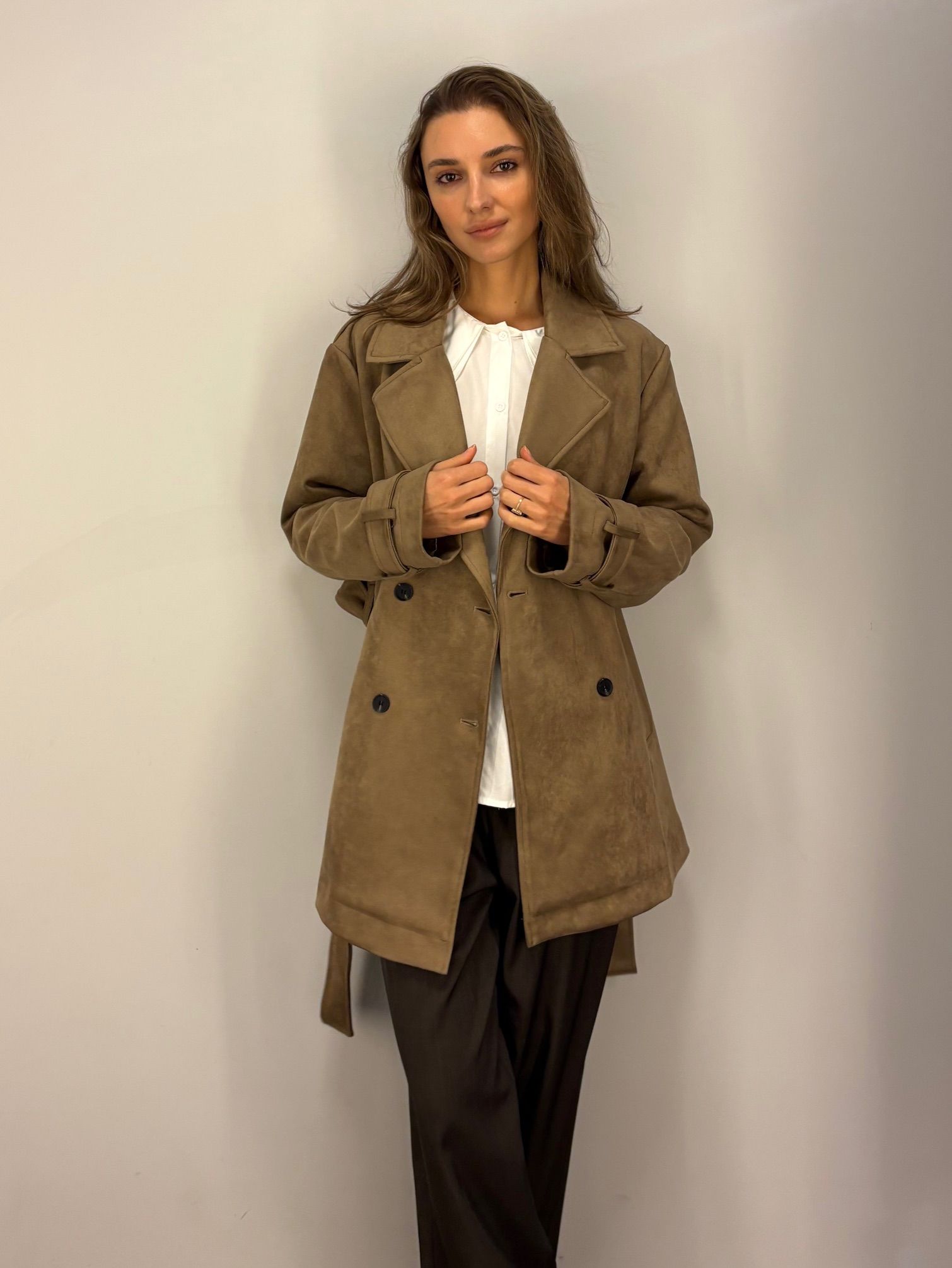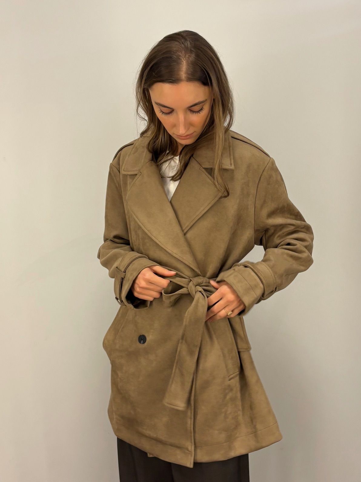 NOWOŚĆ na wiosnę 2026 - kobiecy płaszcz krótki w odcieniu oliwkowej zieleni, khaki, wpadającej w szarość.
