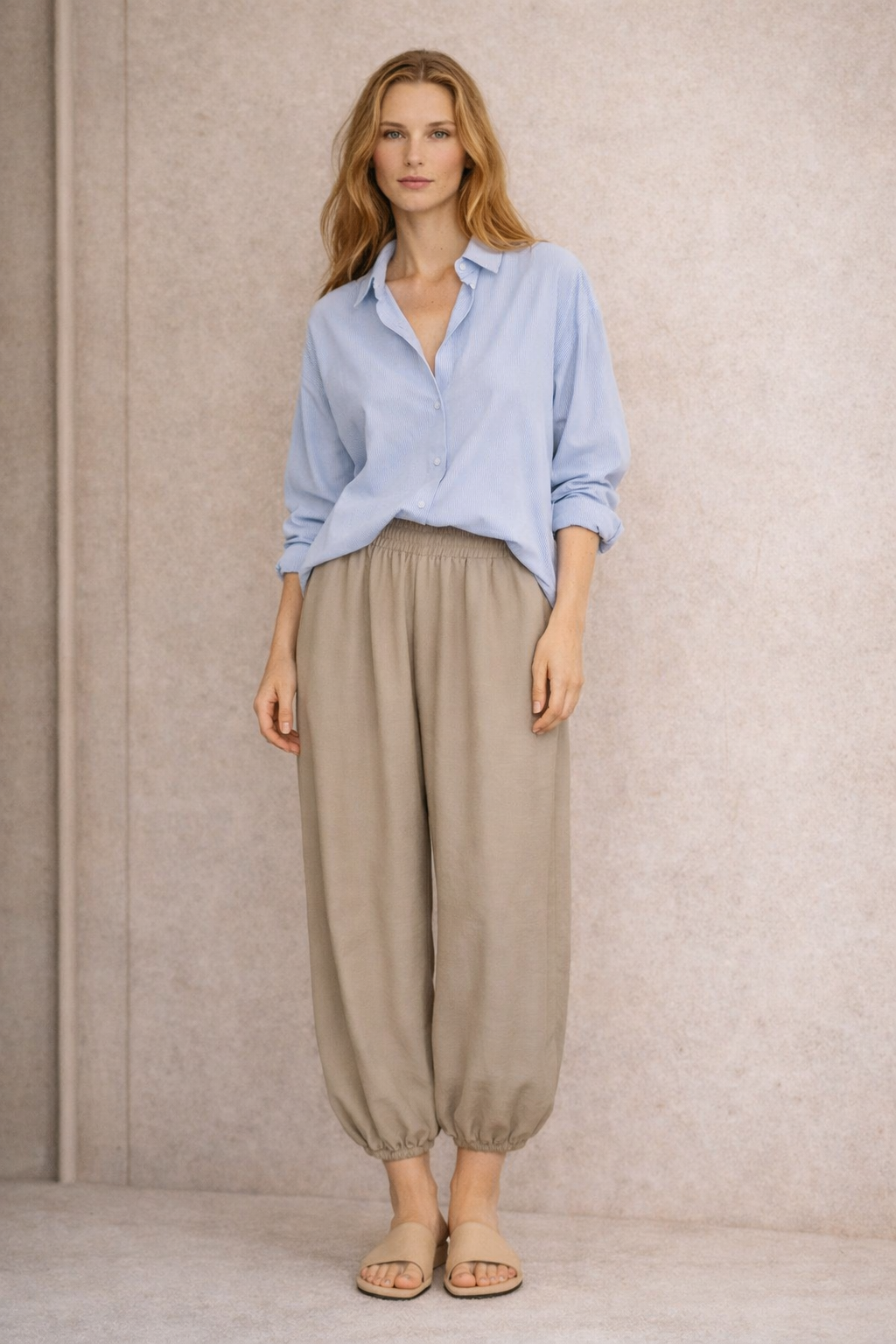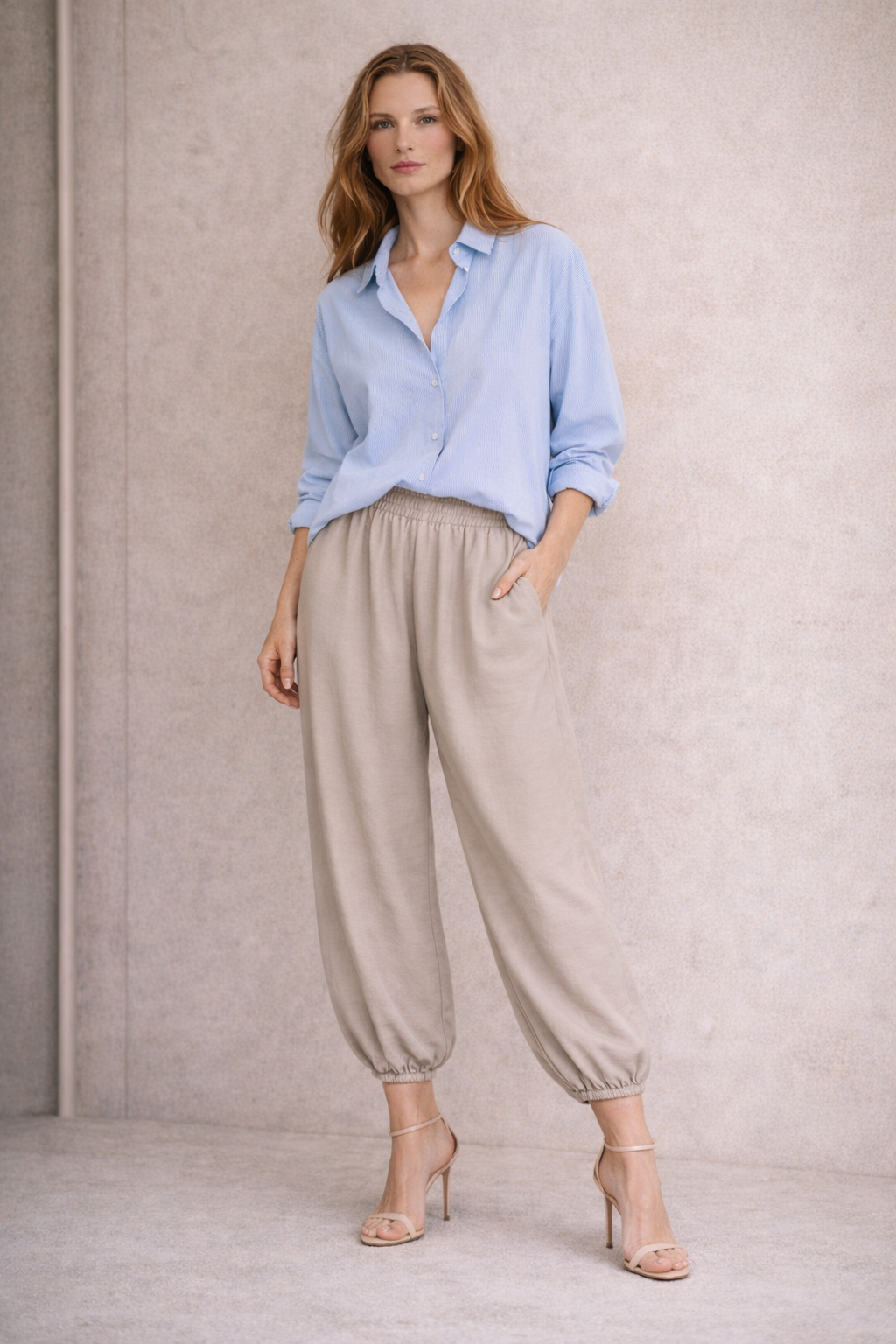 TENCEL, lejący, oddychający materiał idealny na wiosnę i lato. Długość spodni 7/8. Nogawki zakończone gumką.