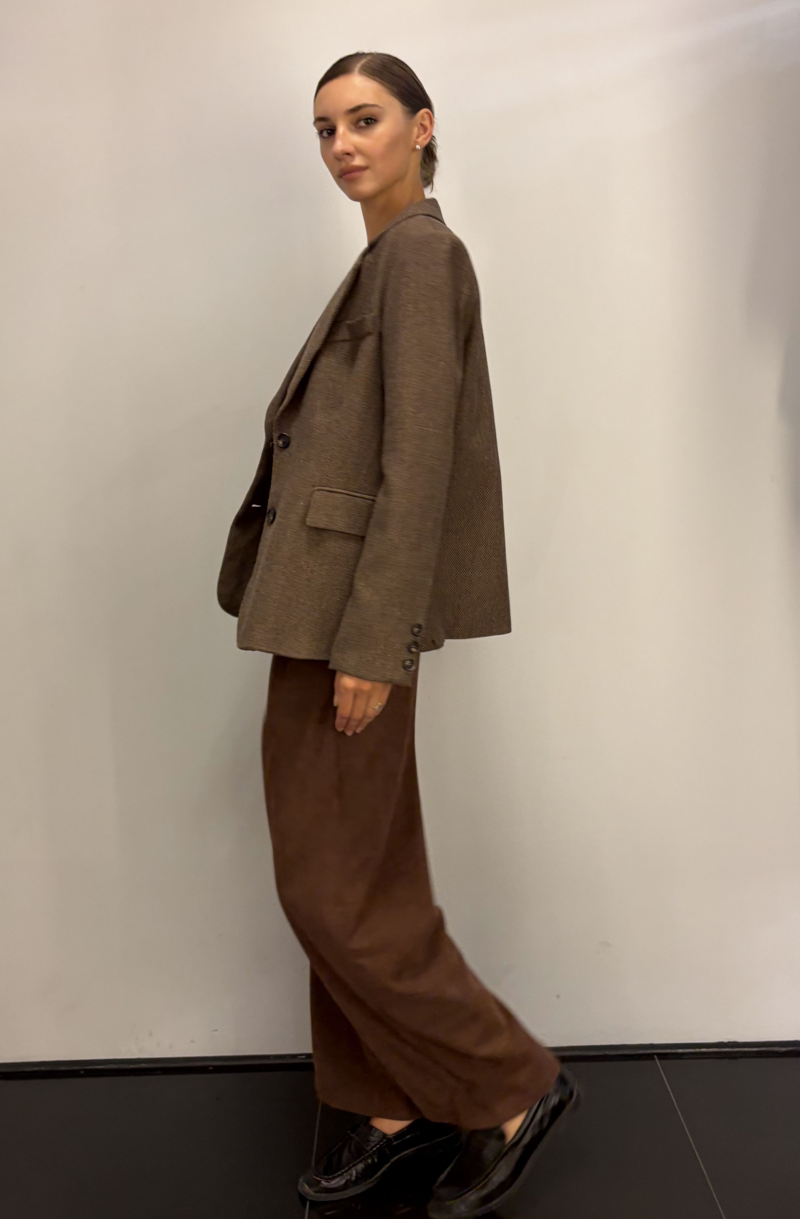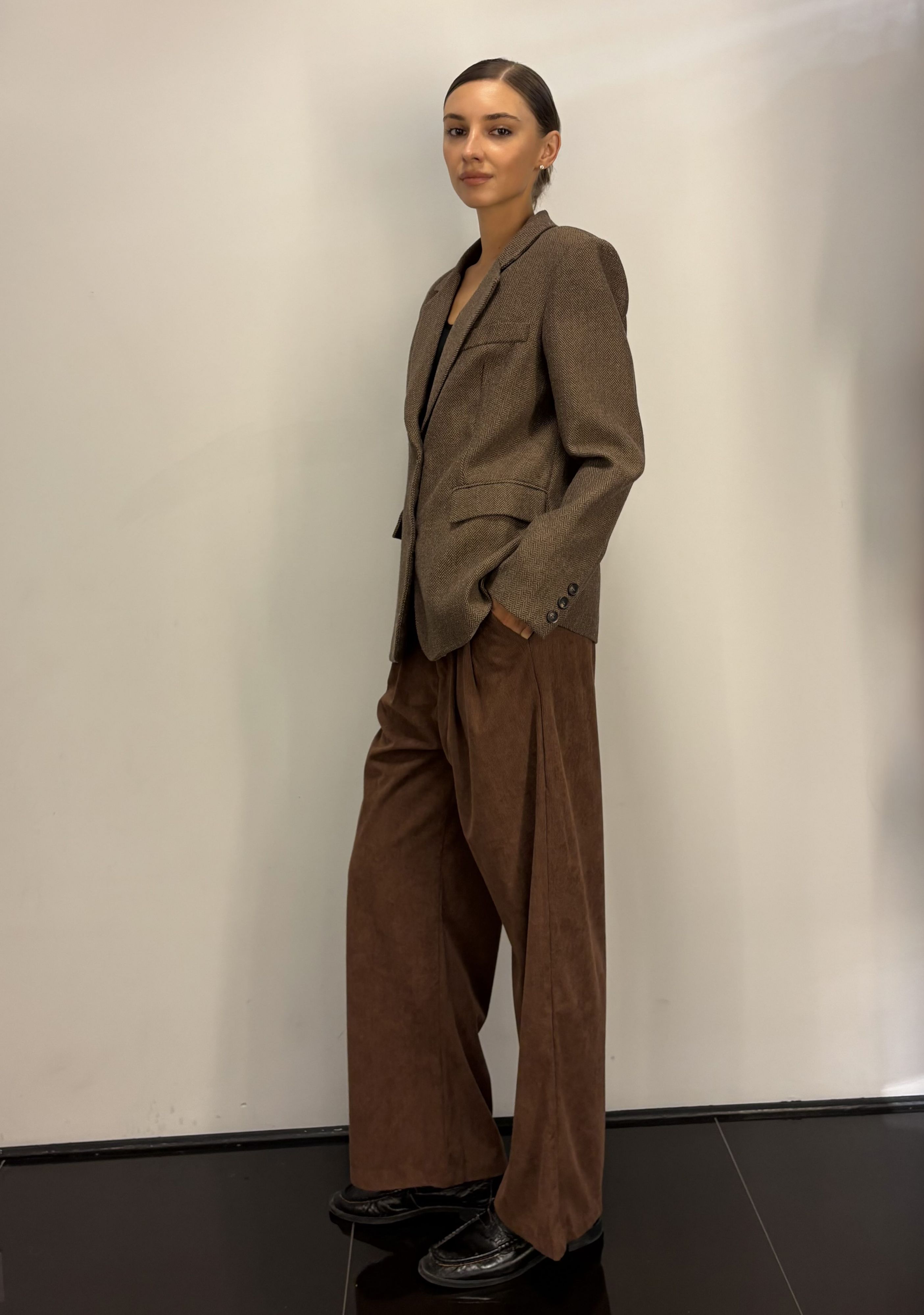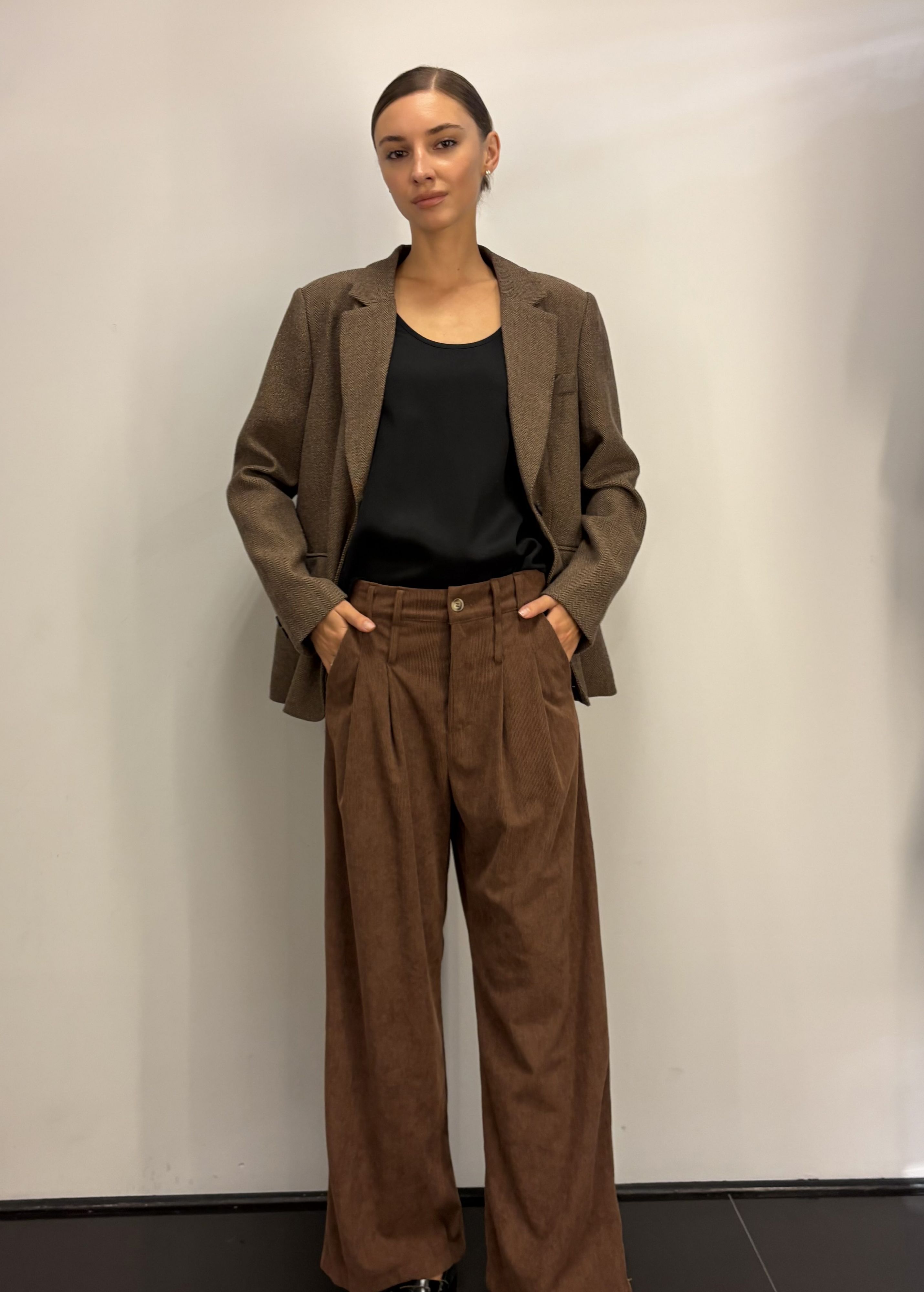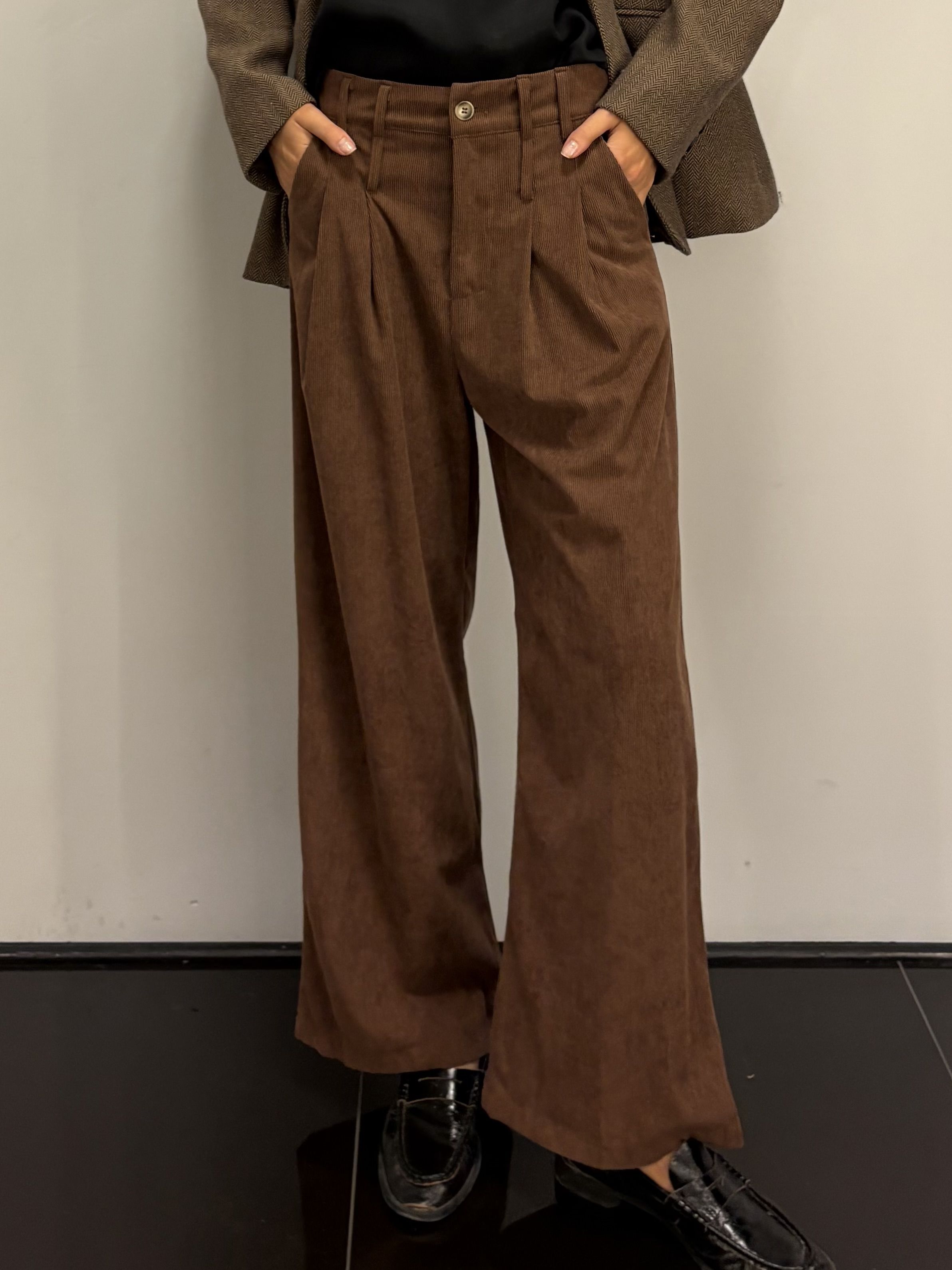 Brązowe spodnie sztruksowe szerokie z zakładkami i suwakiem