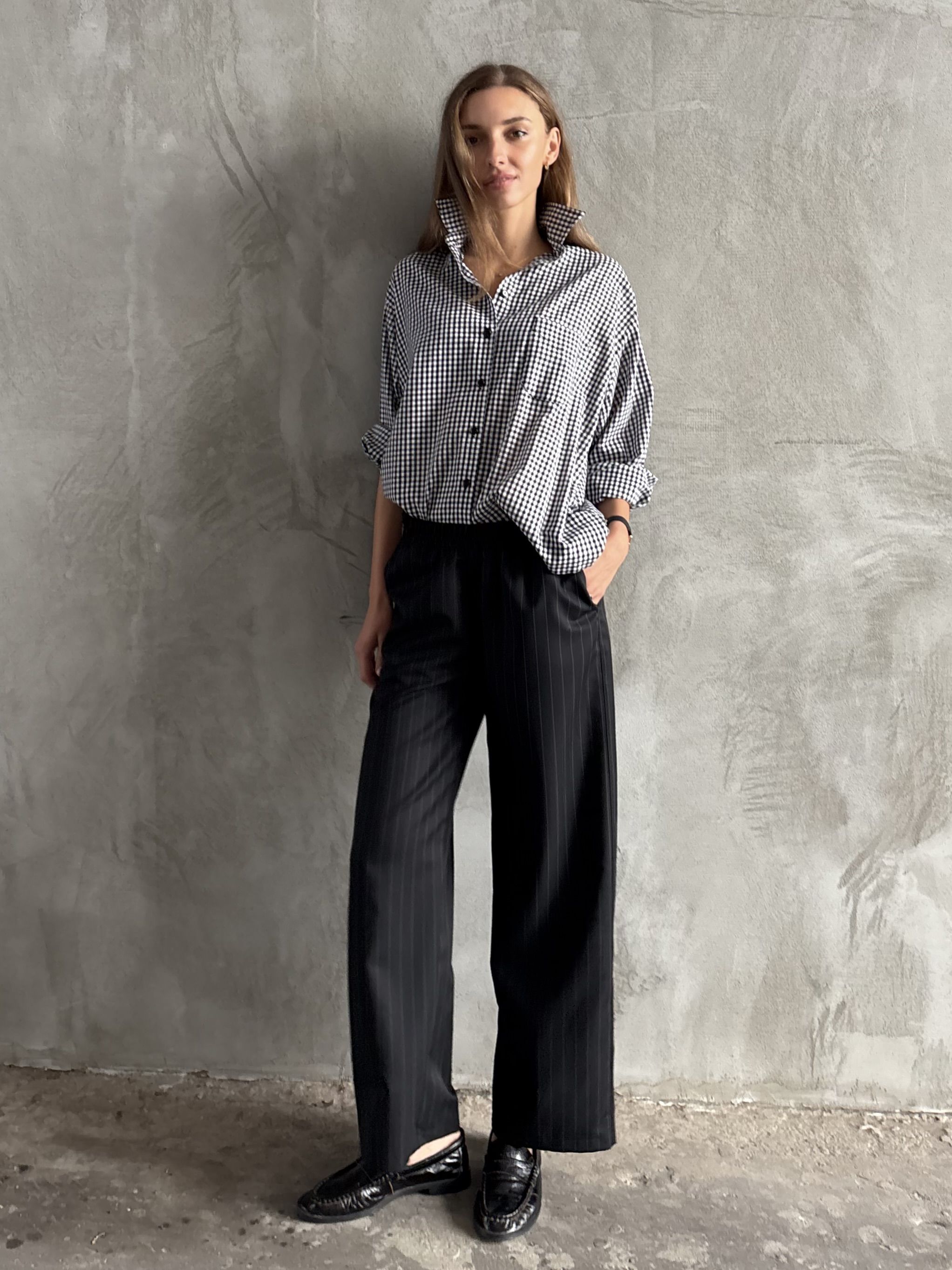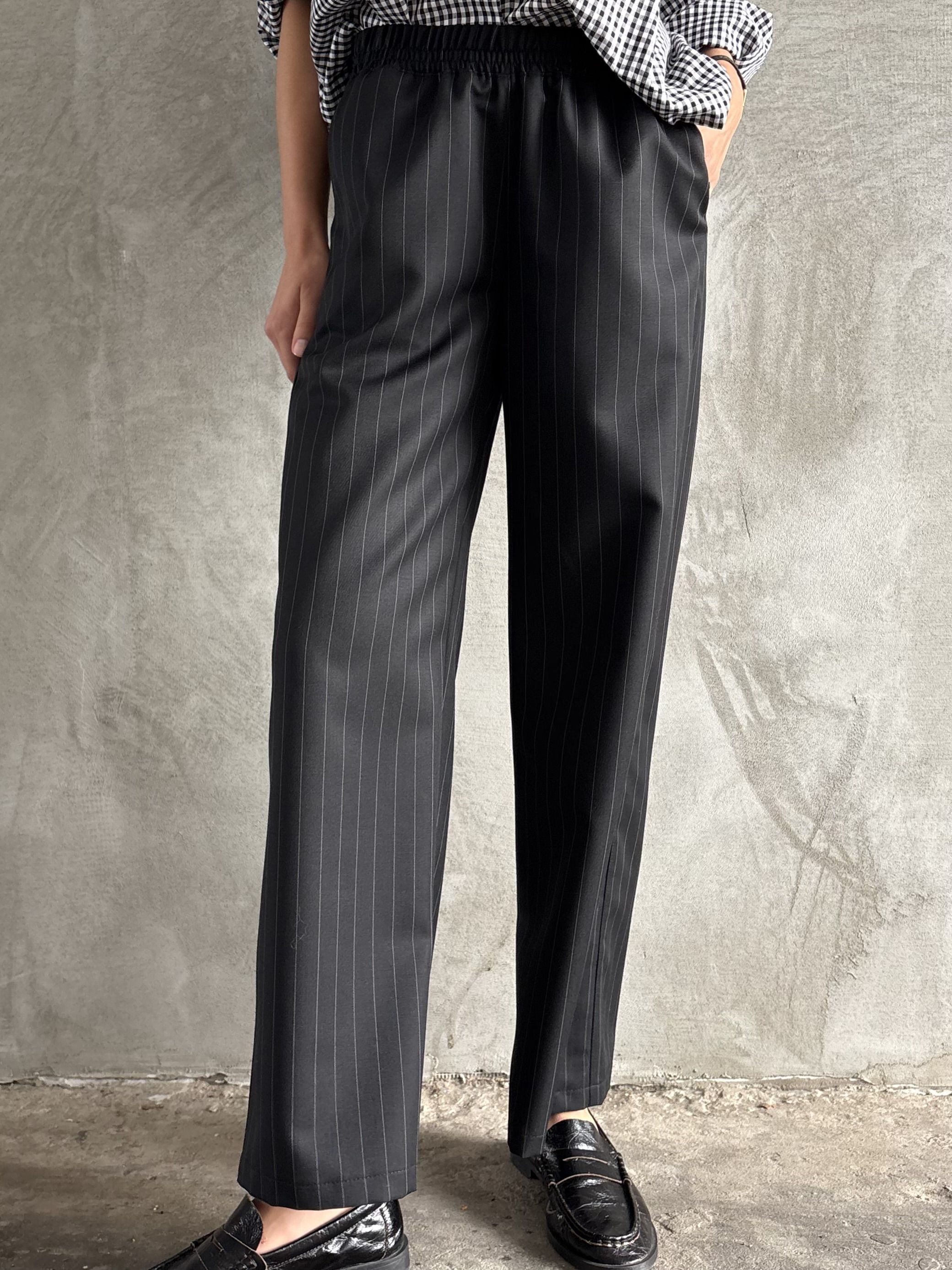 Wygodne, luźne, stylowe spodnie w kolorze czarnym z delikatnym szarym prążkiem.