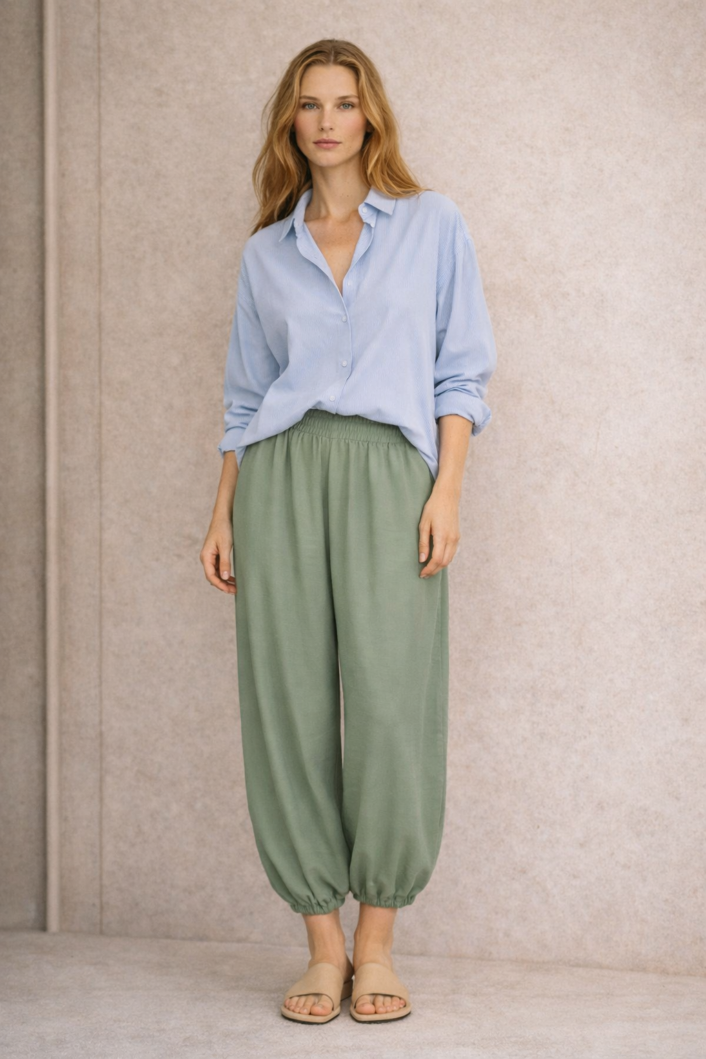 TENCEL, lejący, oddychający materiał idealny na wiosnę i lato. Długość spodni 7/8. Nogawki zakończone gumką.