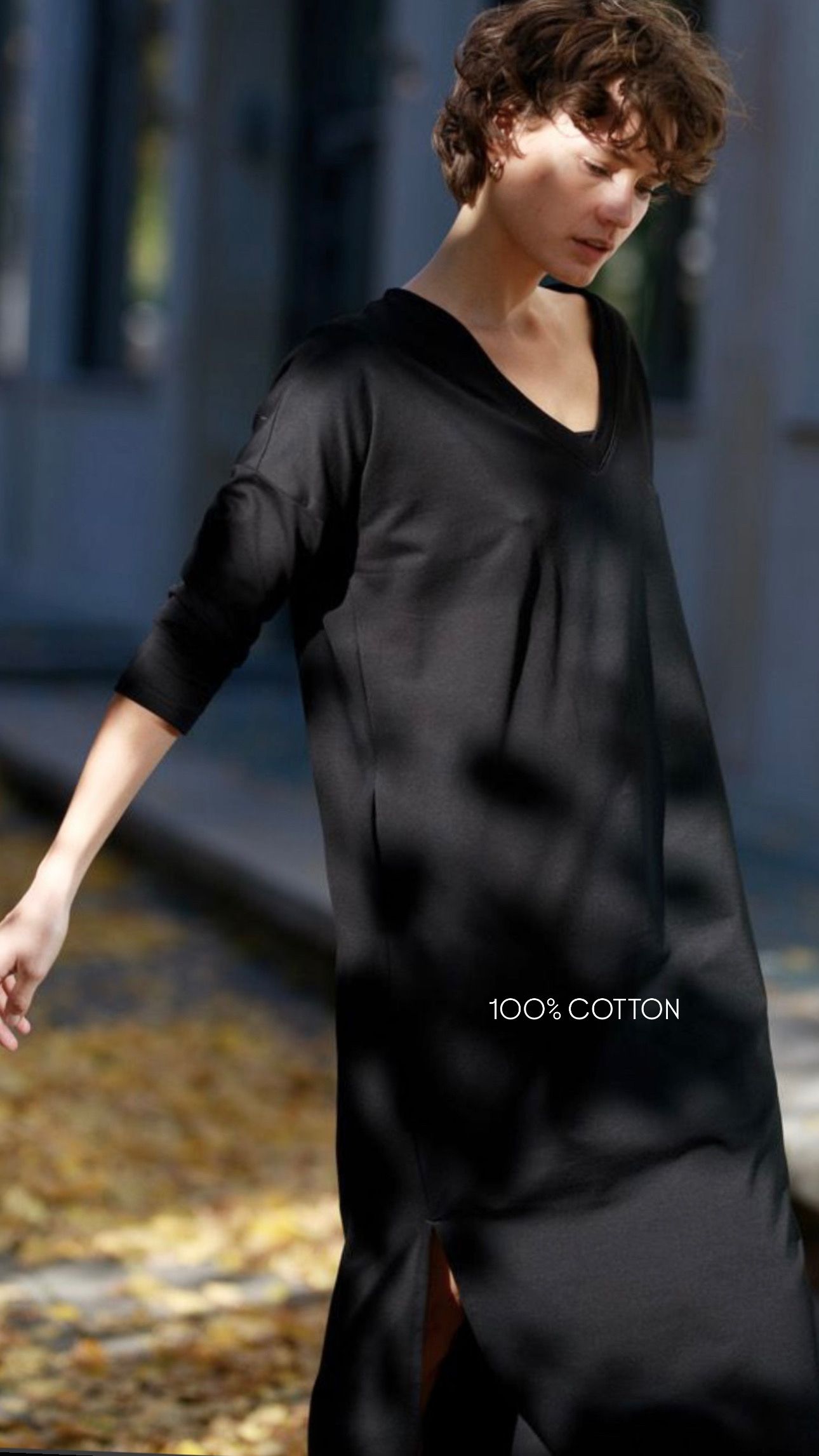Czarna Bawełna 100% ciepła całoroczna, dekolt V, zwężany rękaw i krój lekko zwężany ku dołowi