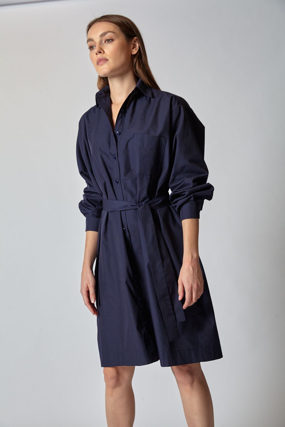 Luźny krój sukienki bazujący na bestsellerwoej koszuli MY STYLE, szeroki rękaw, bardzo wygodny, prosty kształt, długość do kolan, modelka ma 170cm wzrostu