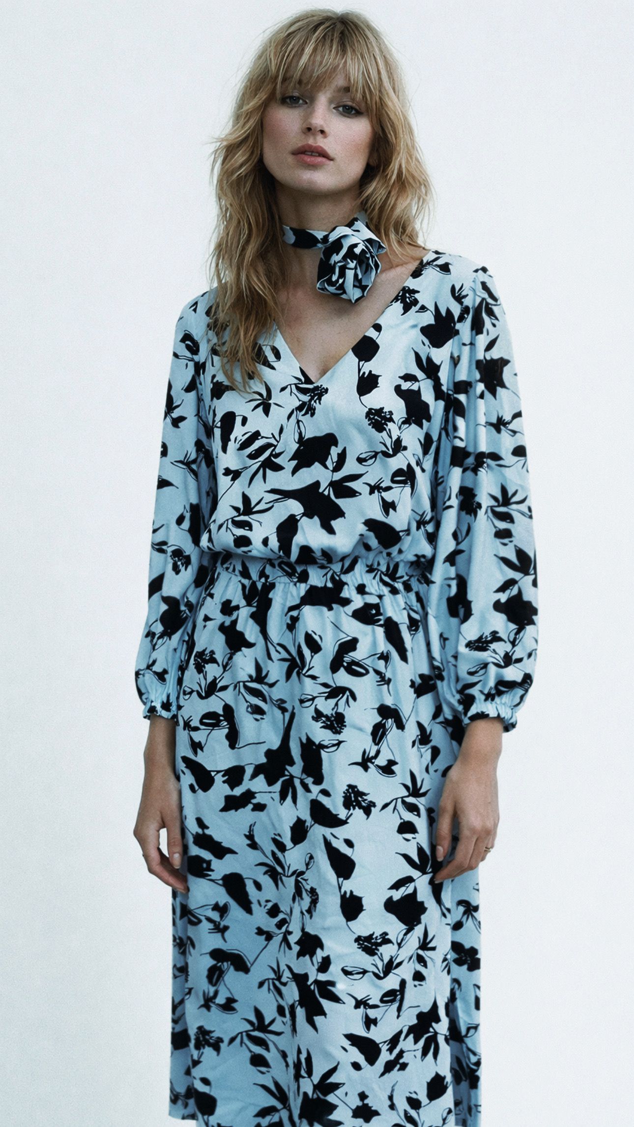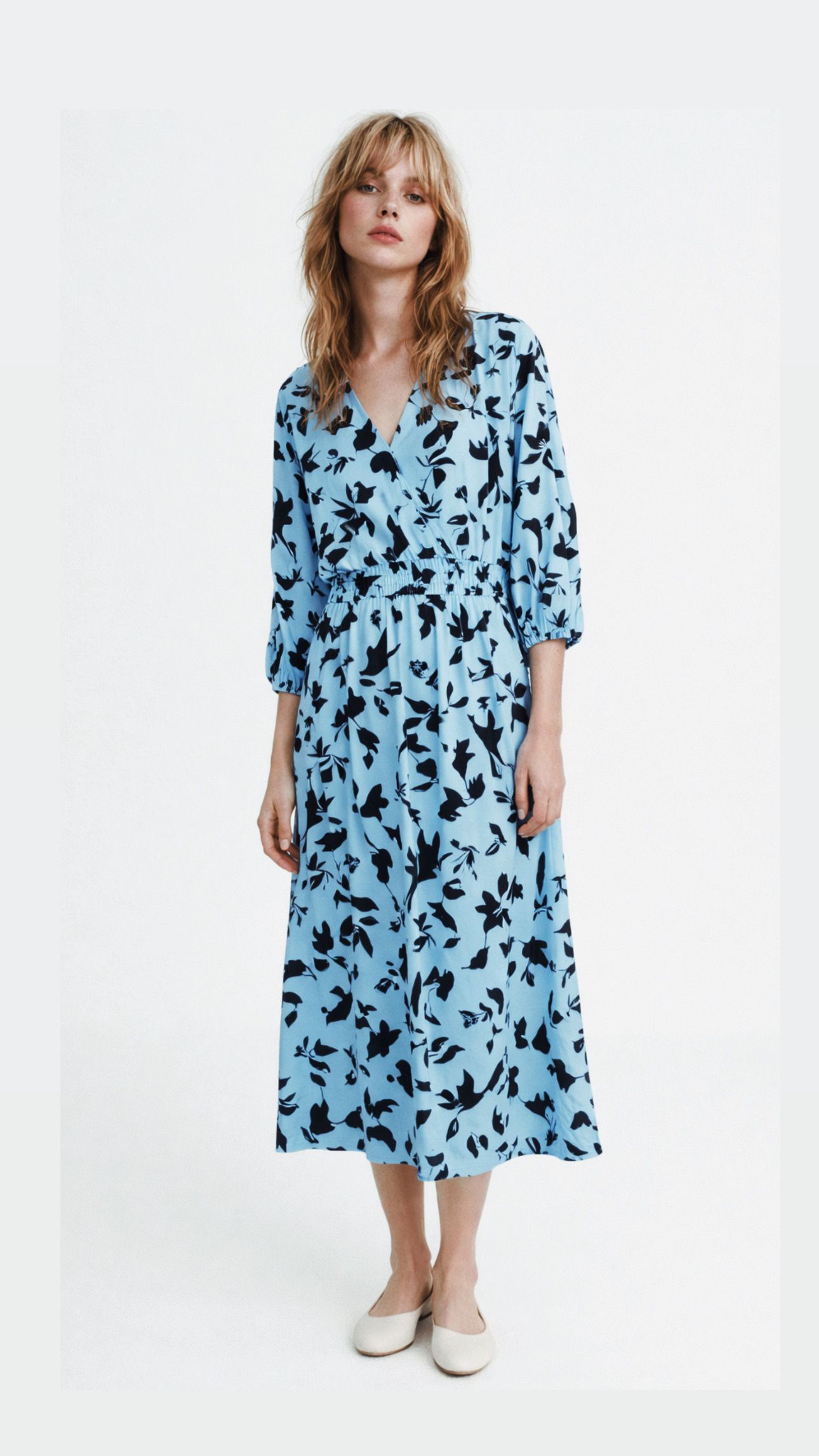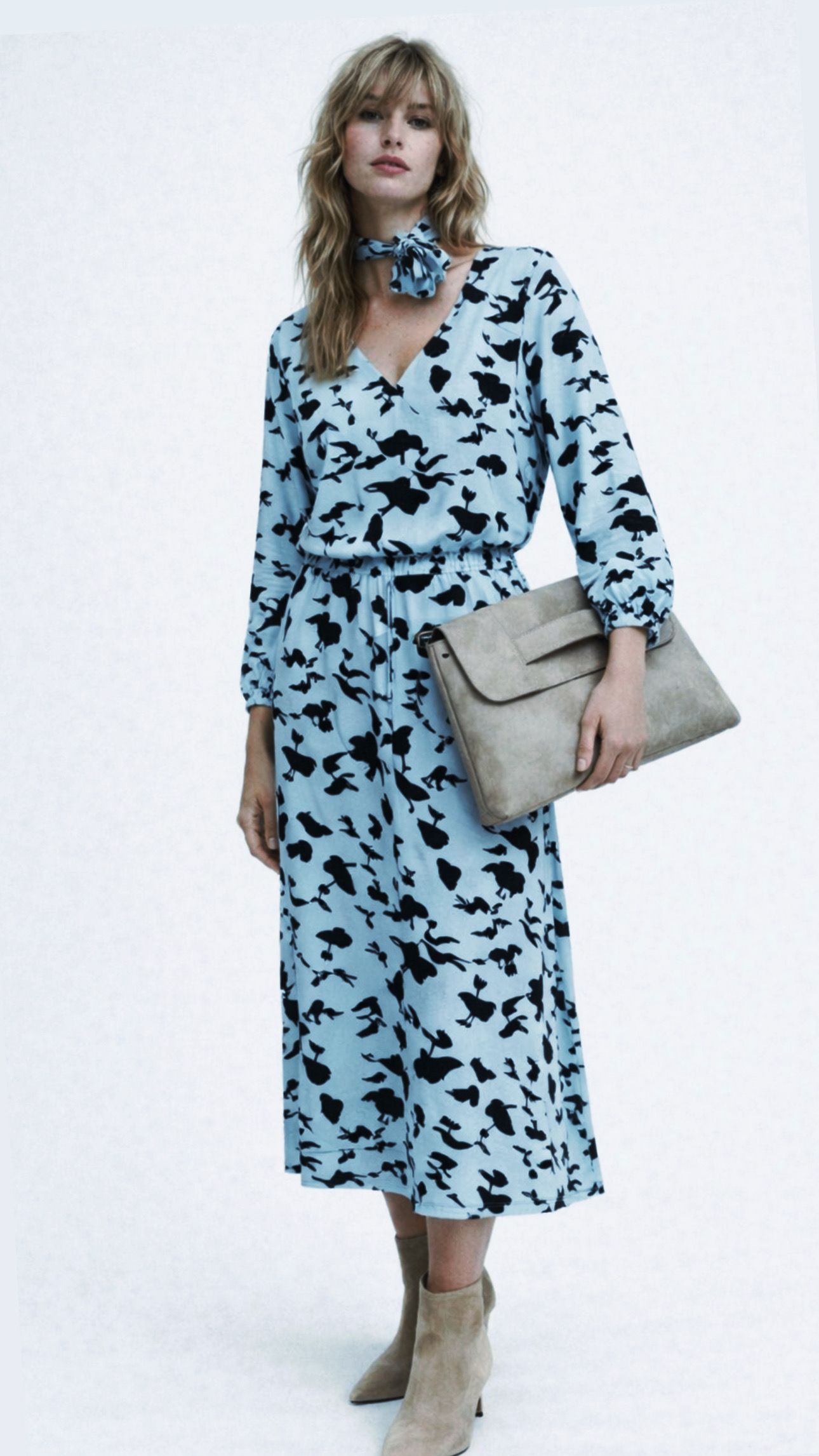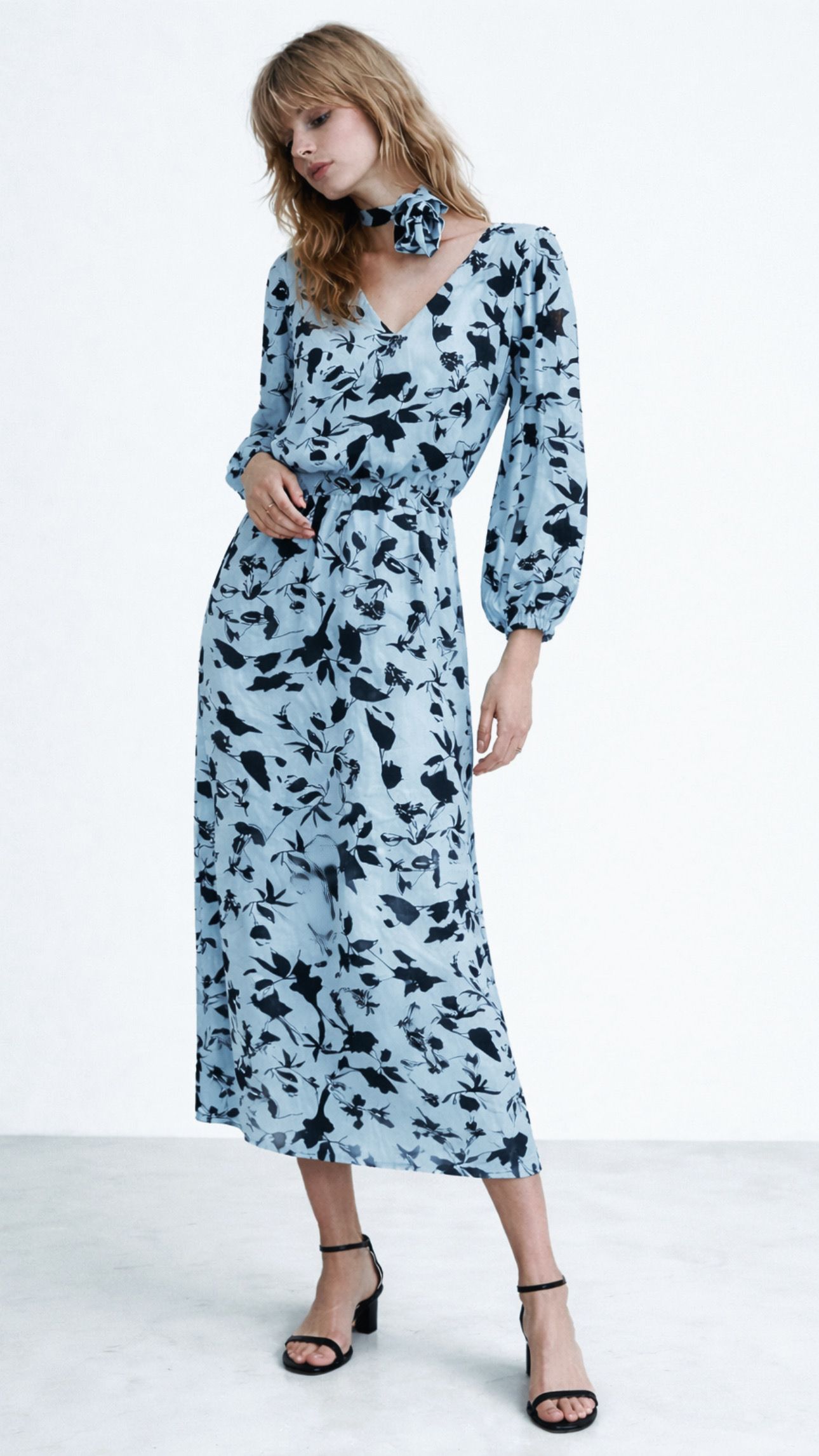 Sukienka midi z printem błękitno-niebiesko-zielonym - w czarne lekkie wzory