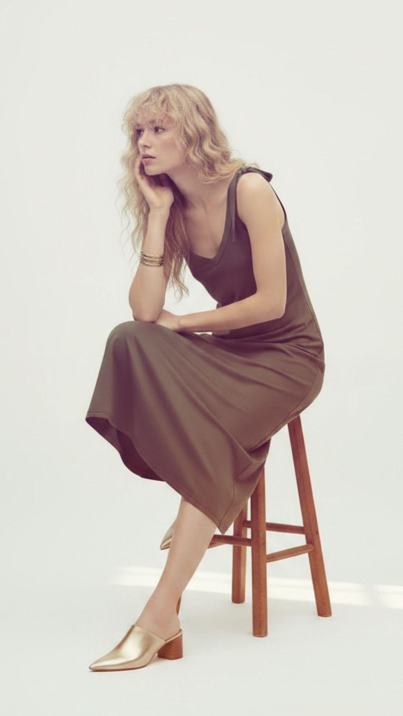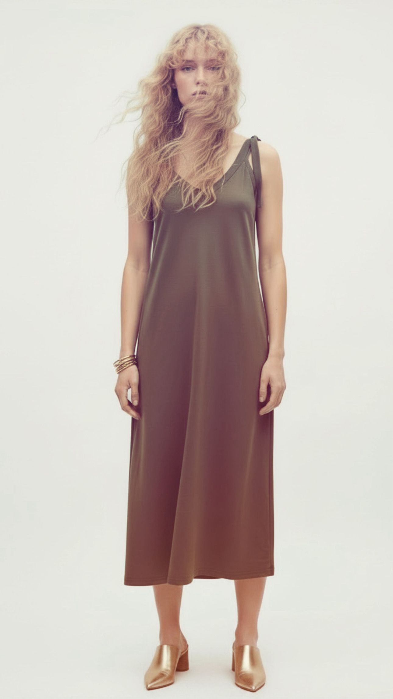 Bawełniana sukienka midi z paskiem, w kolorze khaki, ziemisto zielonym na regulowanych ramiączkach, podkrślająca delikatnie figurę.
