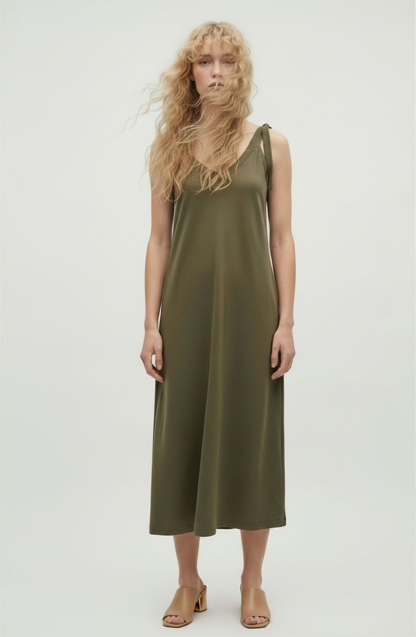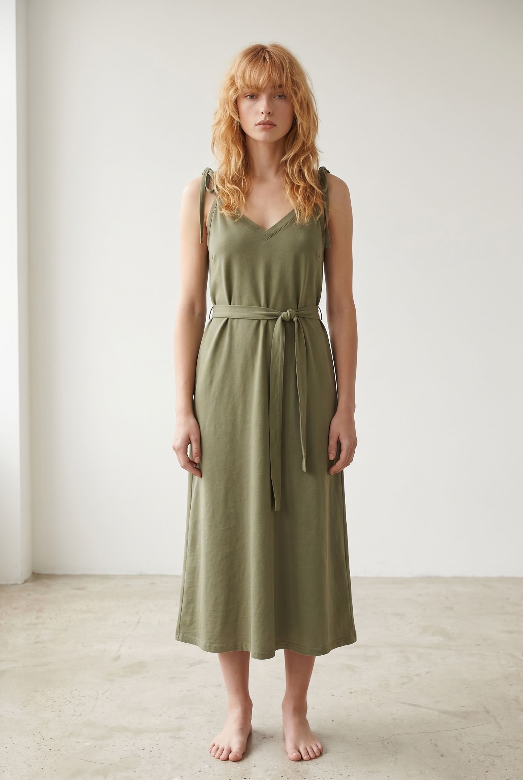 Bawełniana sukienka midi z paskiem, w zielonym kolorze, na regulowanych ramiączkach, podkrślająca delikatnie figurę.