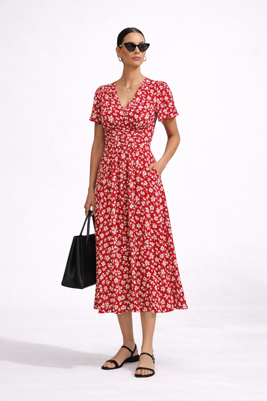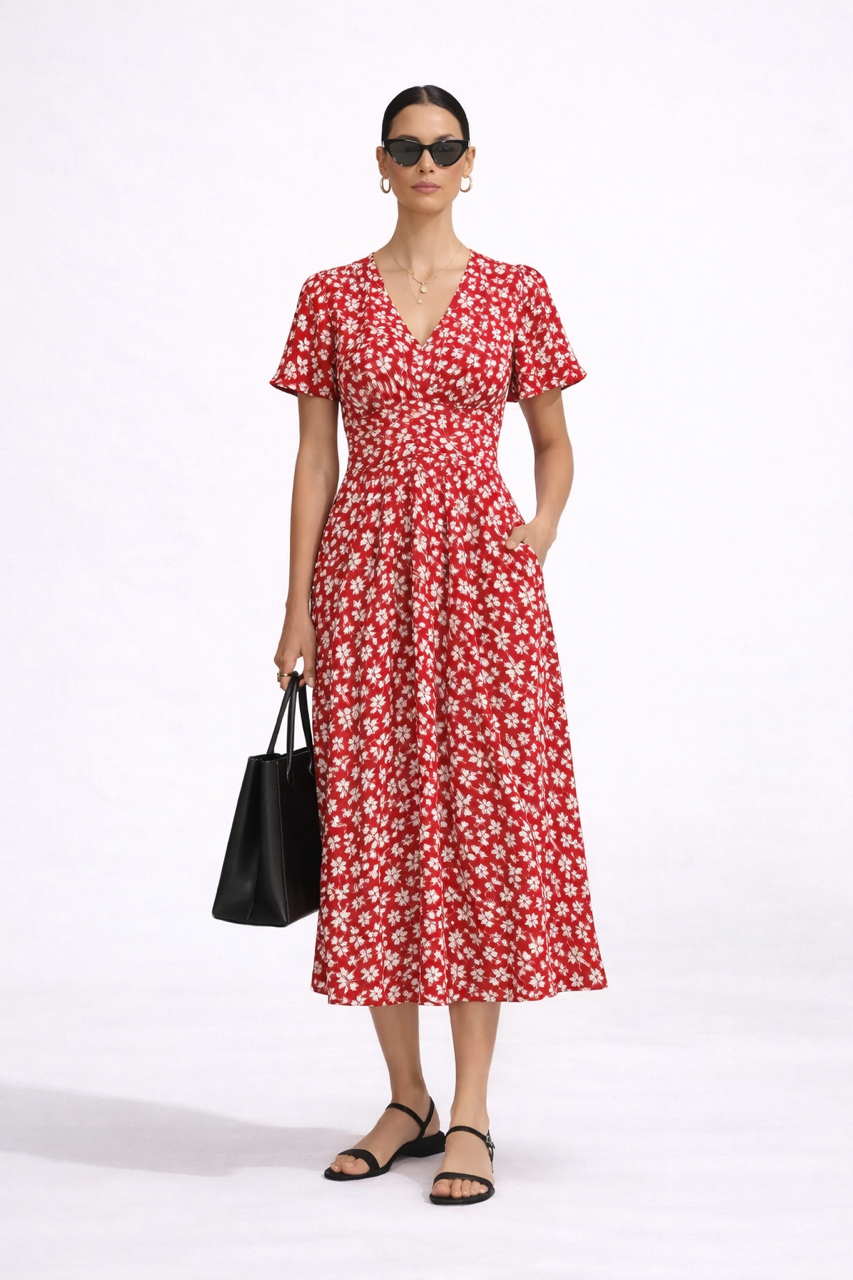 Czerwona Wiskozowa sukienka z rozszerzanym rękawkiem krótkim i ściągaczem pod biustem