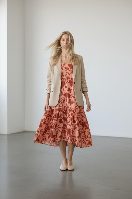100% wiskoza. Sukienka uszyta w Polsce. Materiał lekki, przewiewny, idealny na wiosnę i lato.
