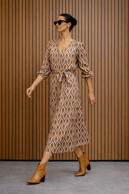 Sukienka 100% wiskoza Jedwabista w dotyku tzw silk touch - z oryginalnym nowoczesnym printem błekitno brązowo beżowym.