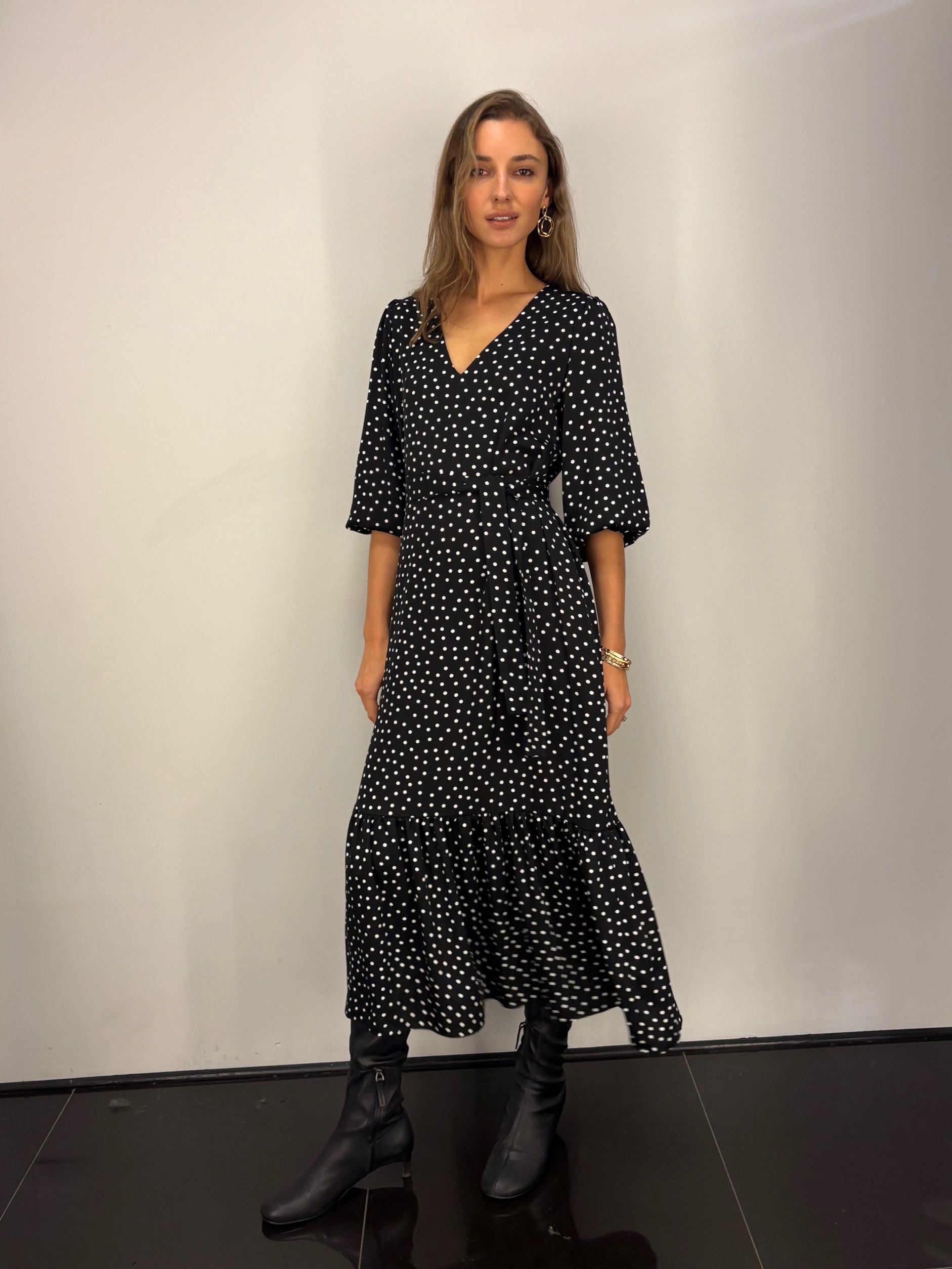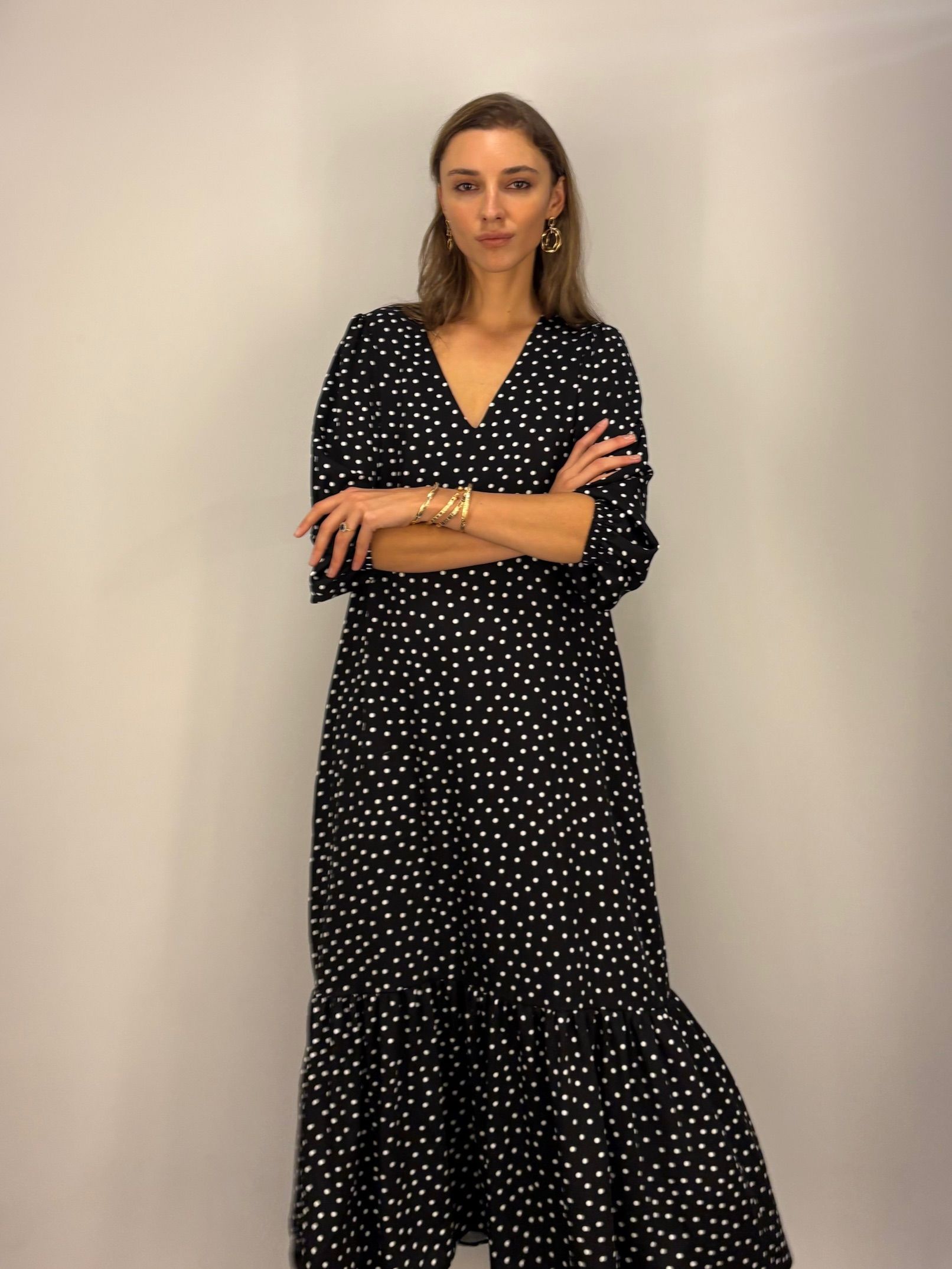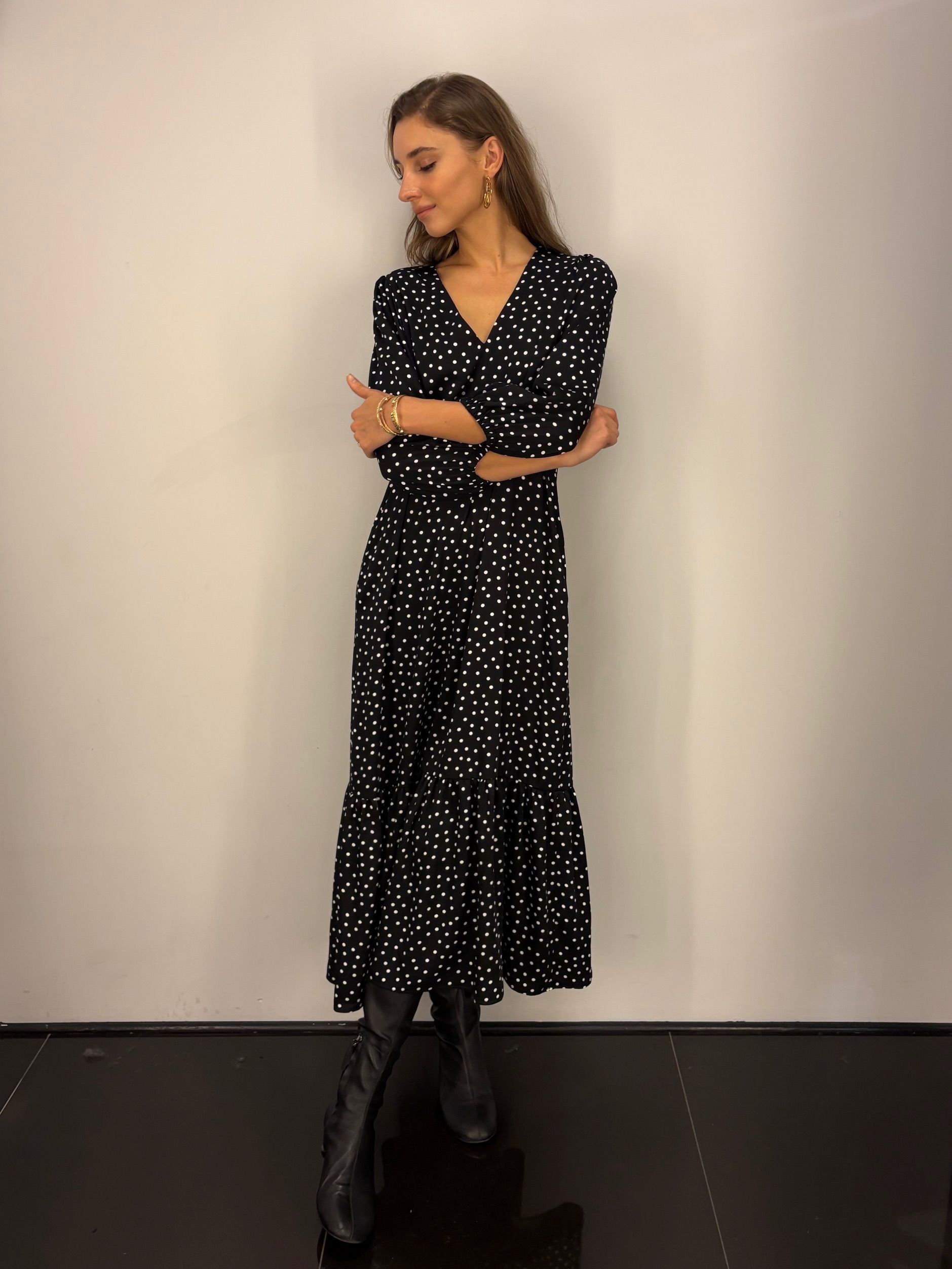 100% wiskoza. Sukienka uszyta w Polsce. Materiał lekki, przewiewny, całoroczny, ale idealny także latem. Klasyczny wzór w białe groszki.
