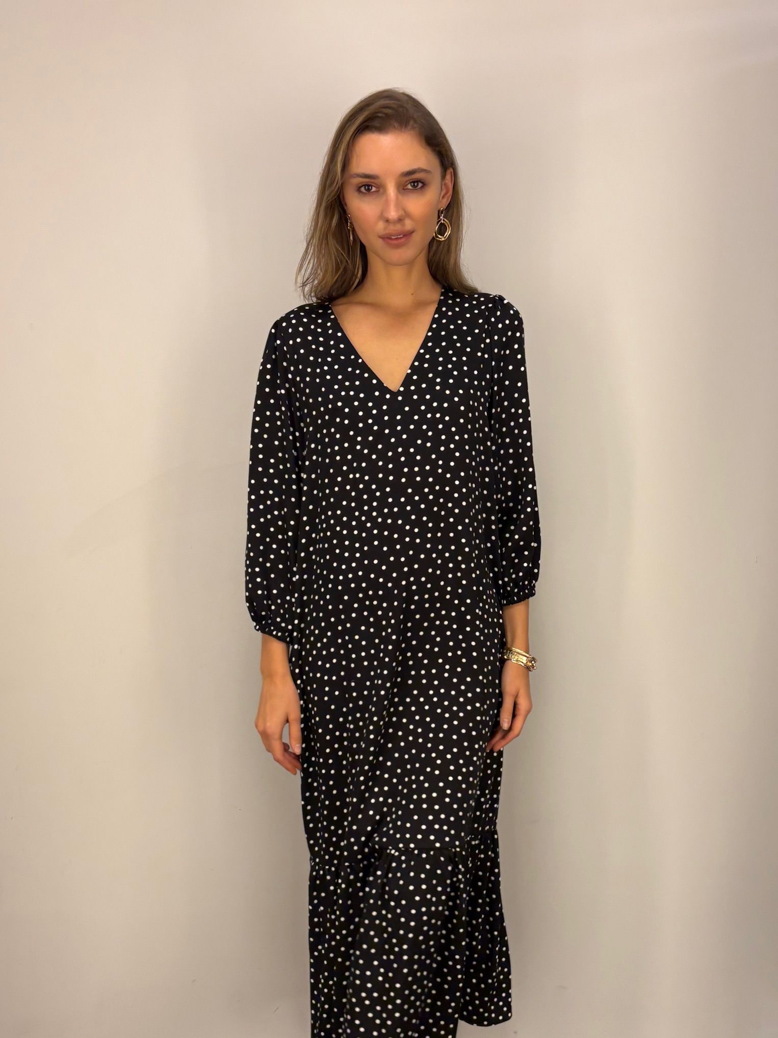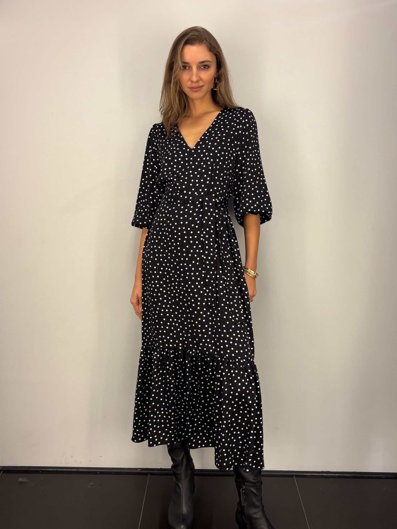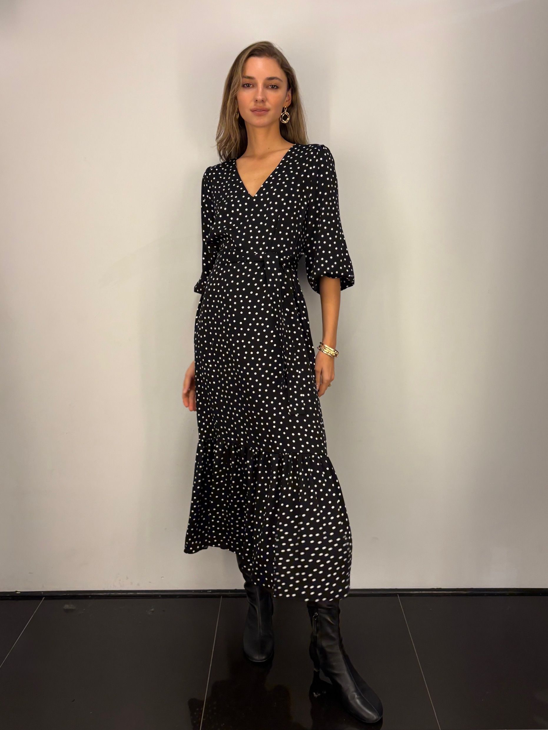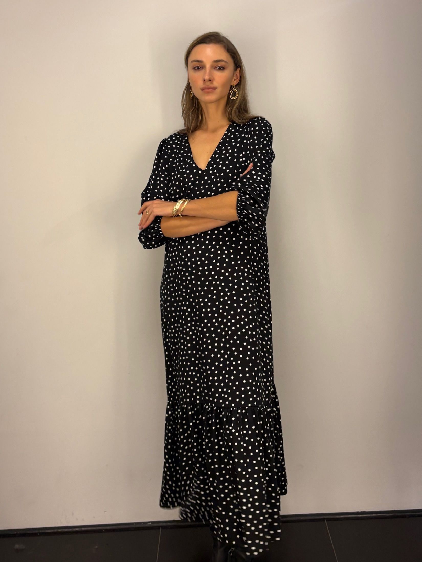 100% wiskoza. Sukienka uszyta w Polsce. Materiał lekki, przewiewny, całoroczny, ale idealny także latem. Klasyczny wzór w białe groszki.