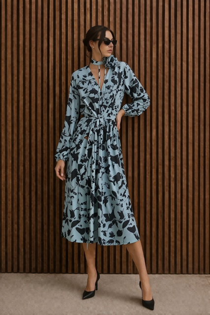 Sukienka midi z printem błękitno-niebiesko-zielonym - w czarne lekkie wzory