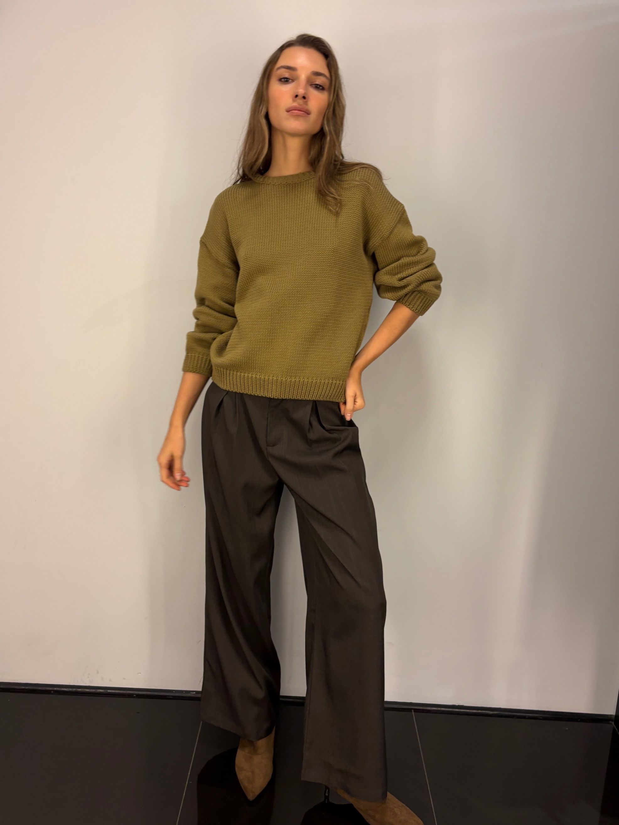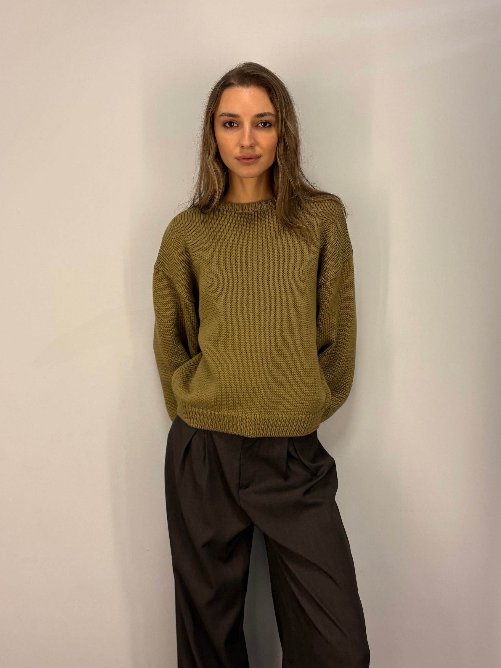 Sweter z okrągłym dekoltem oversize z naturalnej dzianiny bawełny 100% włoskiej - tu w kolorze oryginalnej zieleni w oliwkowym odcieniu, niektórzy ten odcień nazywają jasny khaki