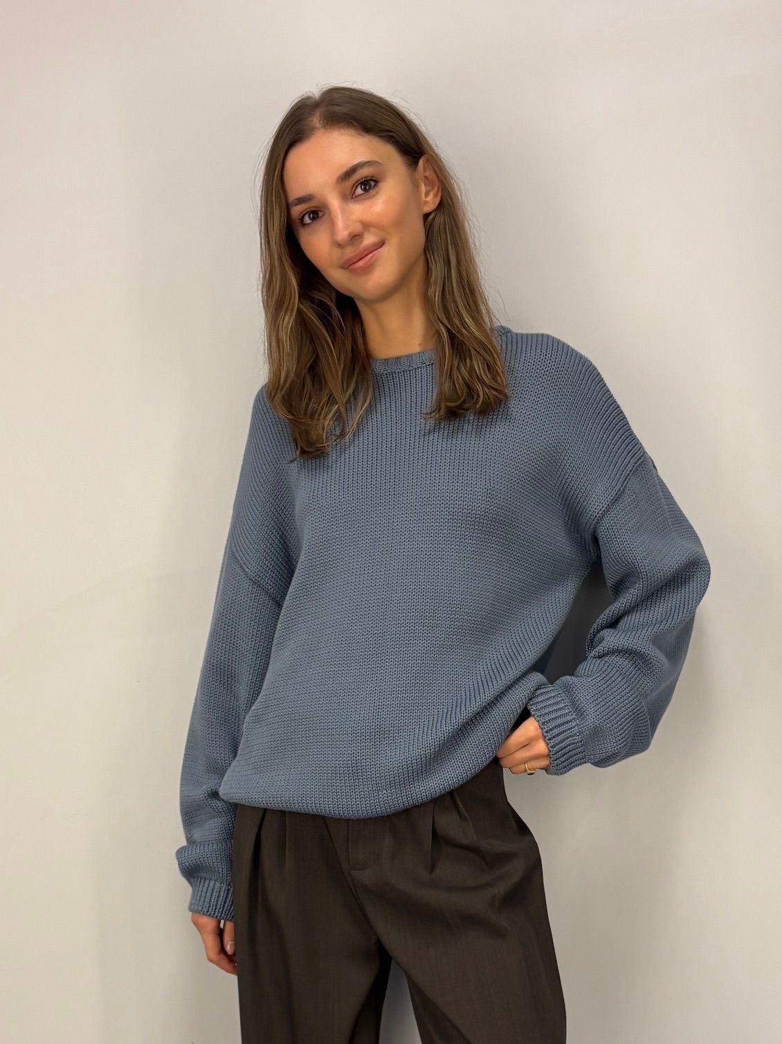 Sweter naturalny 100% bawełny z okrągłym dekoltem oversize z naturalnej dzianiny bawełny 100% włoskiej - tu w kolorze niebieskim, niebiesko - jeansowym