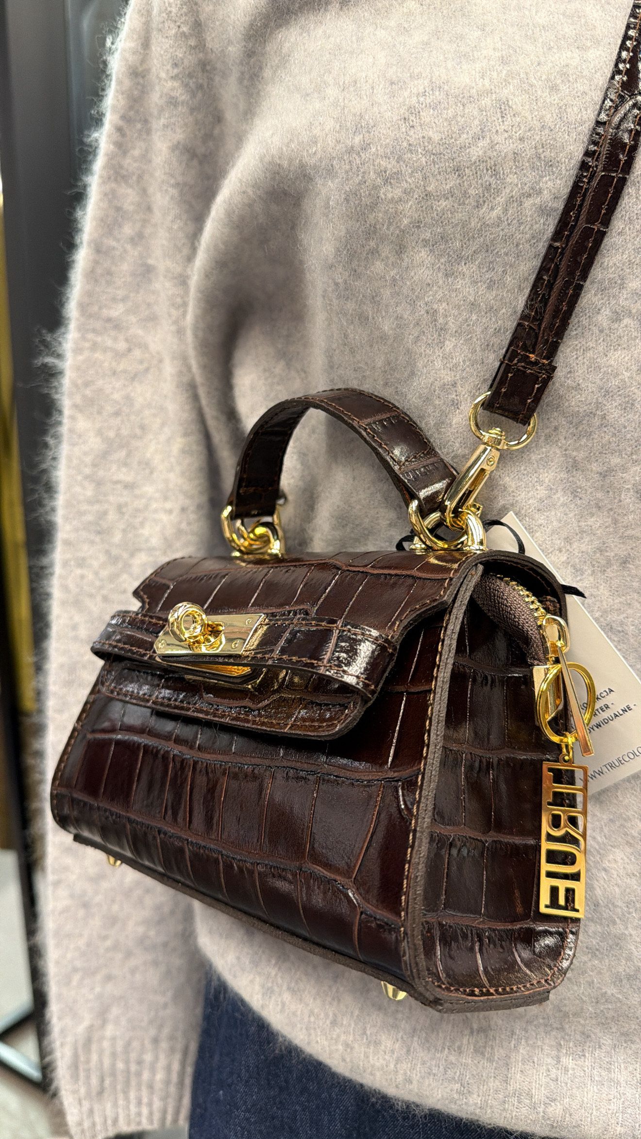 Uszyta ze 100% skóry naturalnej włoskiej, wzorowana na skórę krokodyla - dodatkowo błyszczacą i do wyboru - w kolorze czekoladowym lub czarnym.