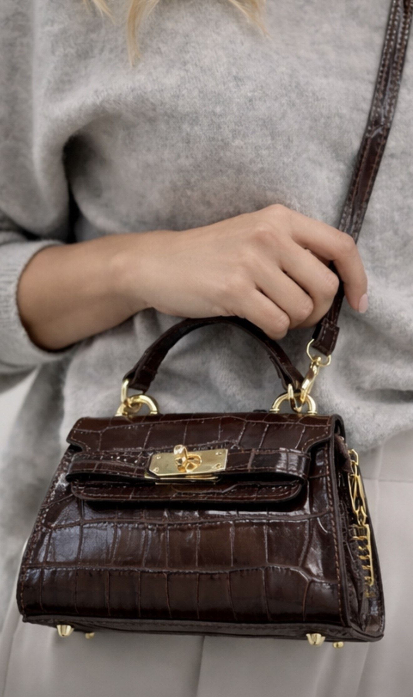 The bag has not only a small handle but also a classic long strap, and its exterior closure – seemingly very complicated – is actually a classic magnetic clasp.
