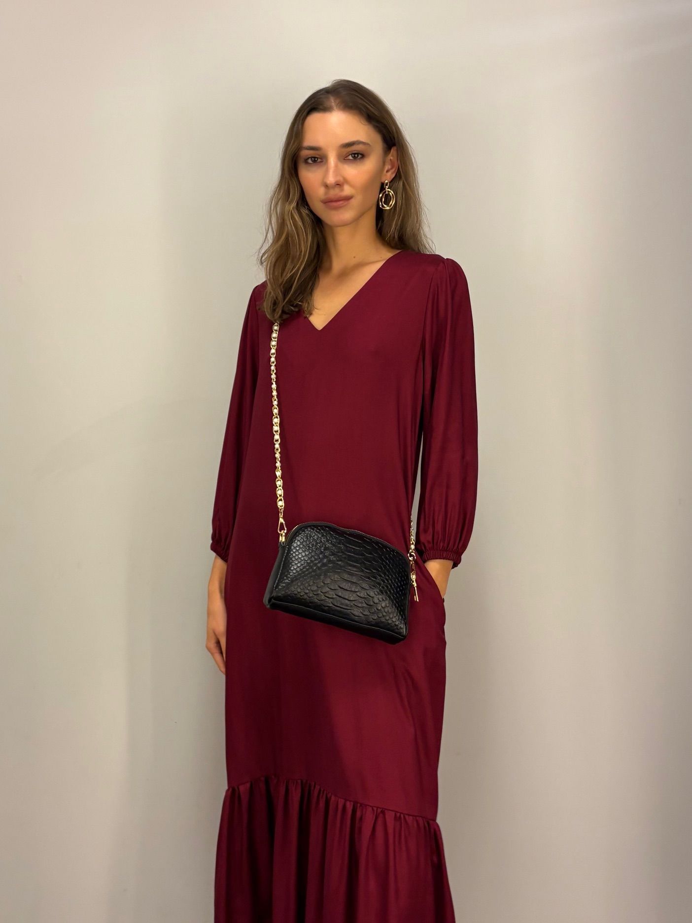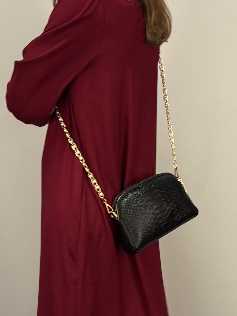 Delikatny kształt, czarna wyrazisty skóra naturalna ze wzorem przypominającym krokodyla, złote Okucia w standardzie. asek skórzany w kolorze czarnym opcjonalnie dyspozycji złoty łańcuszek z perełkami białymi